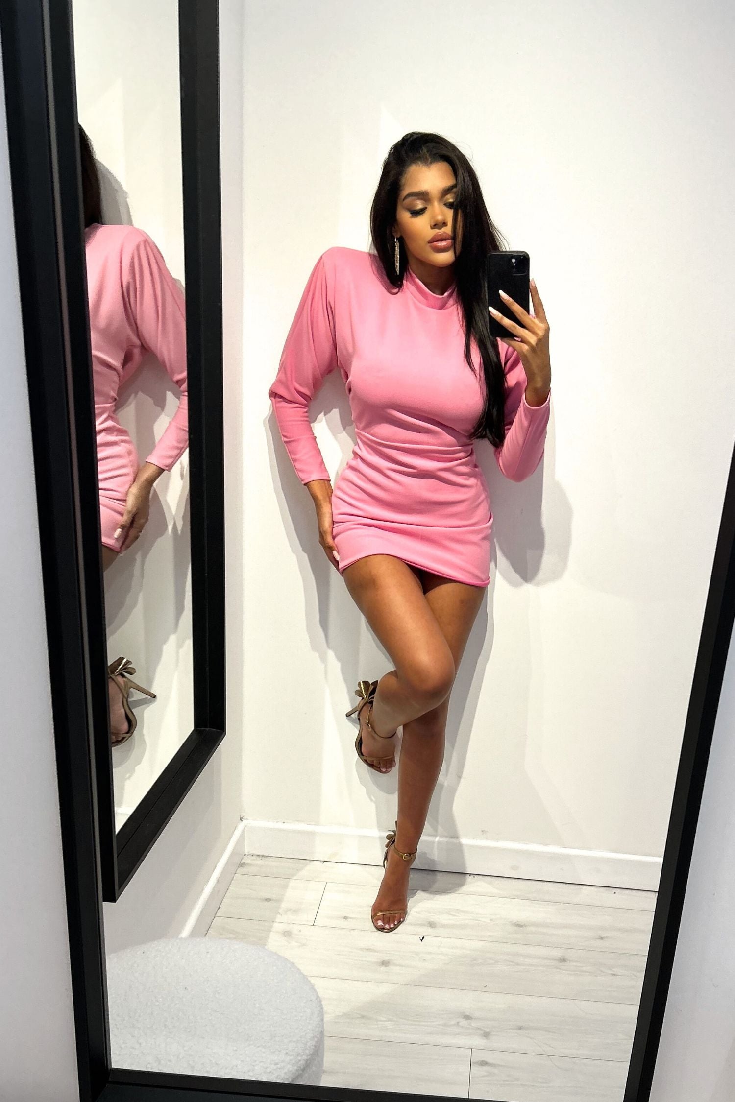 ADDISON HIGH NECK SHOULDER PAD MINI DRESS - PINK MACAROON