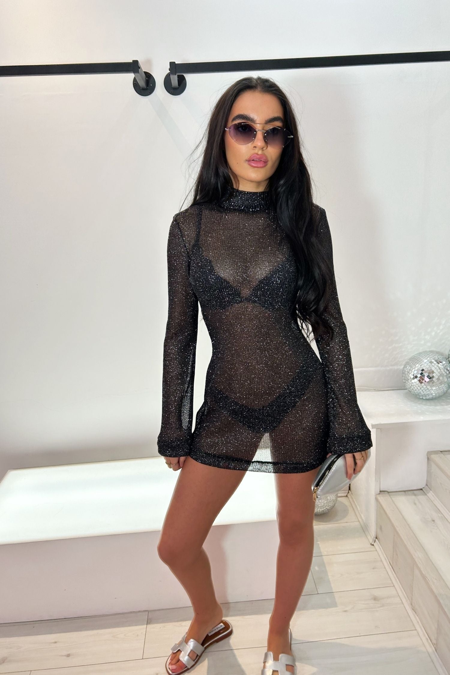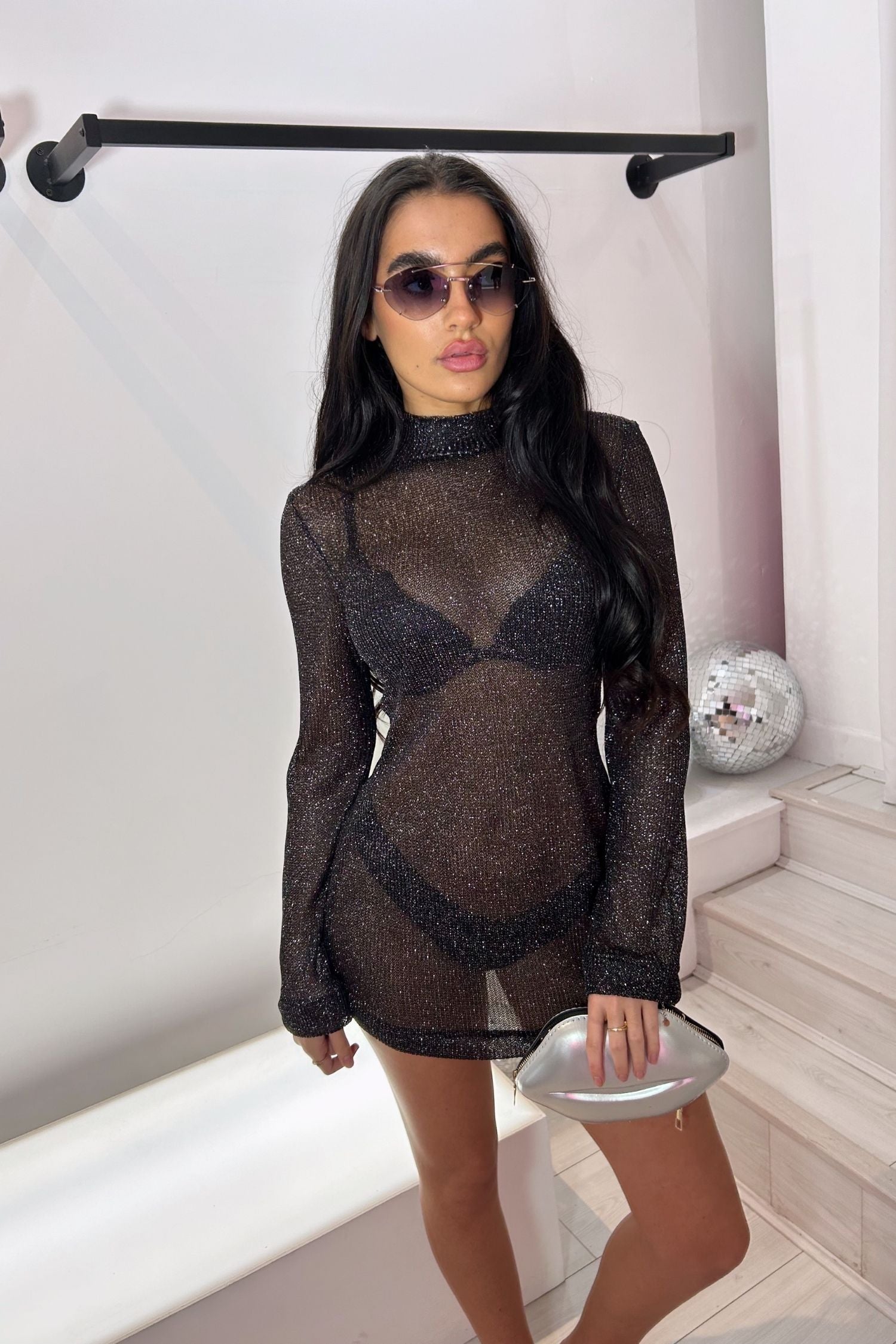ALENA LONG SLEEVE LUREX KNITTED MINI DRESS - BLACK IN STOCK XS