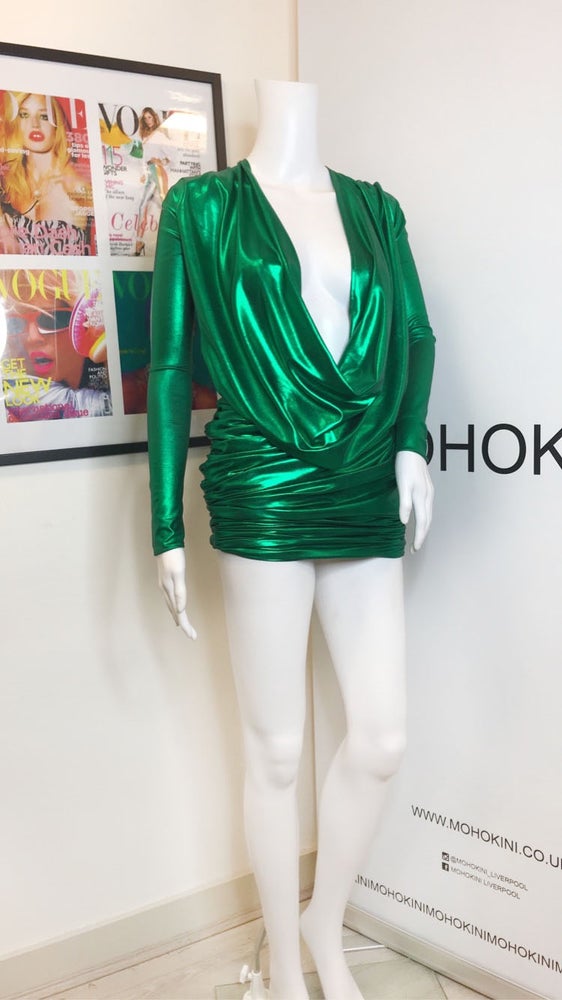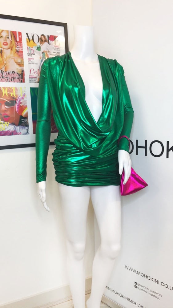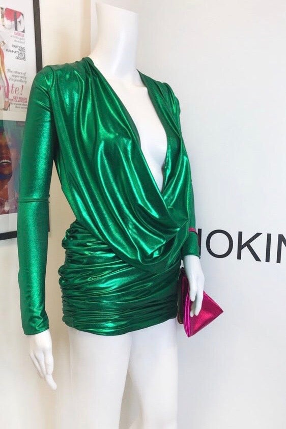 Our stunning deep plunge ANNA mini-dress in this bold, metallic emerald fabric. The most comfortable dress and perfect for hiding the food baby this party season. Featuring strong shoulders, deep plunge, ruching and metallic! Everything we love! Retro glam eat your heart out. Also available to order bespoke in a variety of fabrics. - True to size (order your usual size) - Deep plunge neck (can be altered as required) - Cool hand wash - Dry flat - Stretch fabric - Easy fit
