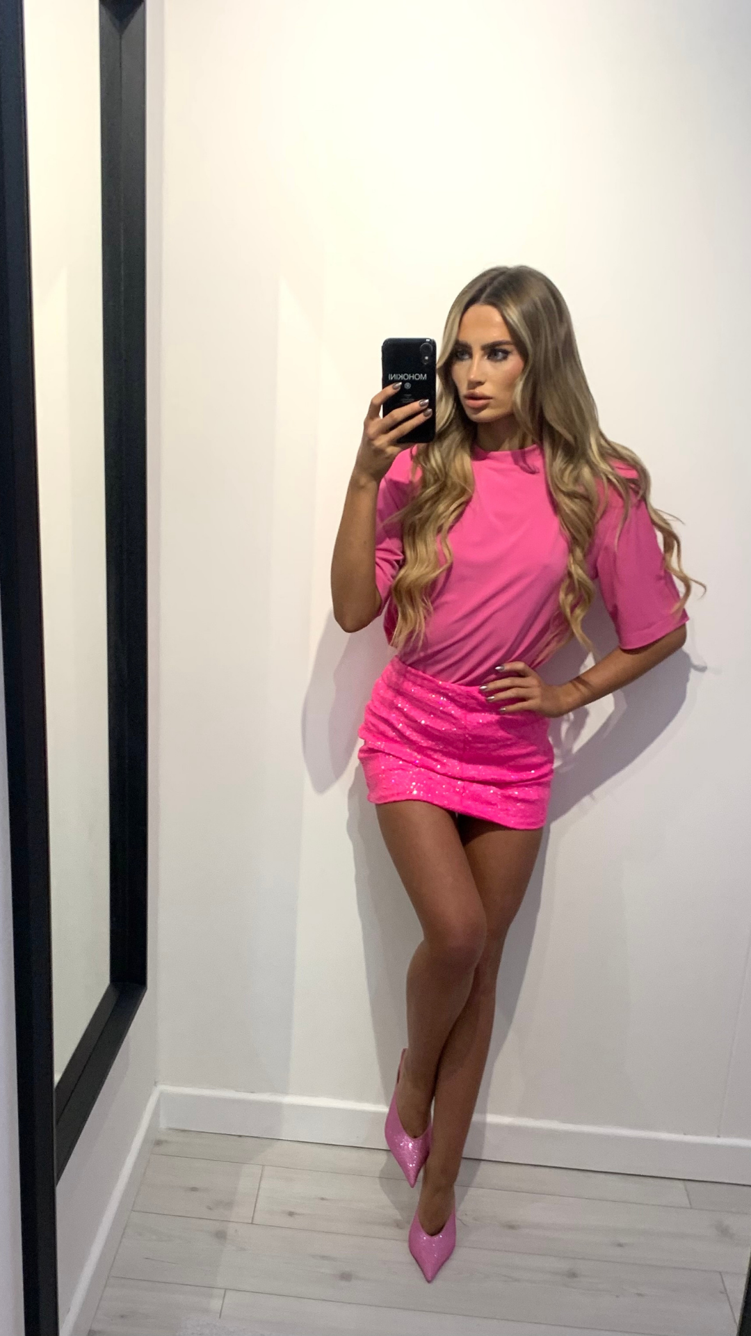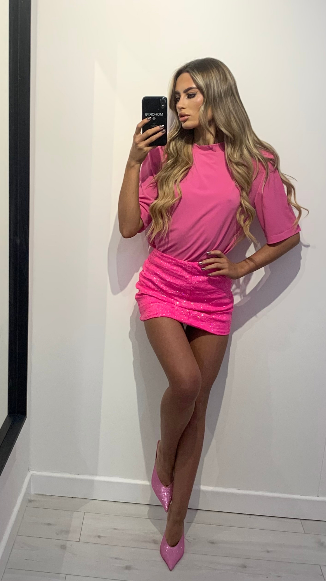ANNIE X CONNA PADDED SHOULDER TSHIRT AND NEON PINK SEQUIN SKIRT