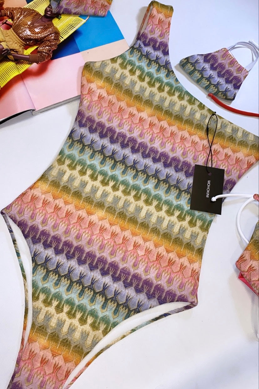 One shoulder swimsuit ARIA in our LIGHT MAMBO PRINT, beautiful knit fabric. (Please note: Face Mask needs to be ordered separately) - Hand wash - Fits true to size. comment the colour you would like in the checkout notes if different to main photo. Add your measurements, height and sizing notes to help achieve the perfect fit xx See our size guide for help. All prices include VAT at 20%