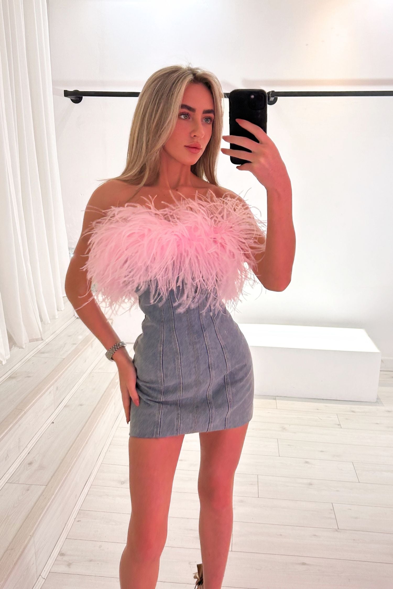 Turn heads with the Astra Denim Dress — a bold fusion of structure and softness. Crafted from thick, rigid denim for a sculpted fit, this bandeau mini dress features an exaggerated pink feather trim for full glam impact. Finished with a sleek zip fastening for ease and a snatched silhouette, it’s the ultimate statement piece for nights you'll never forget.