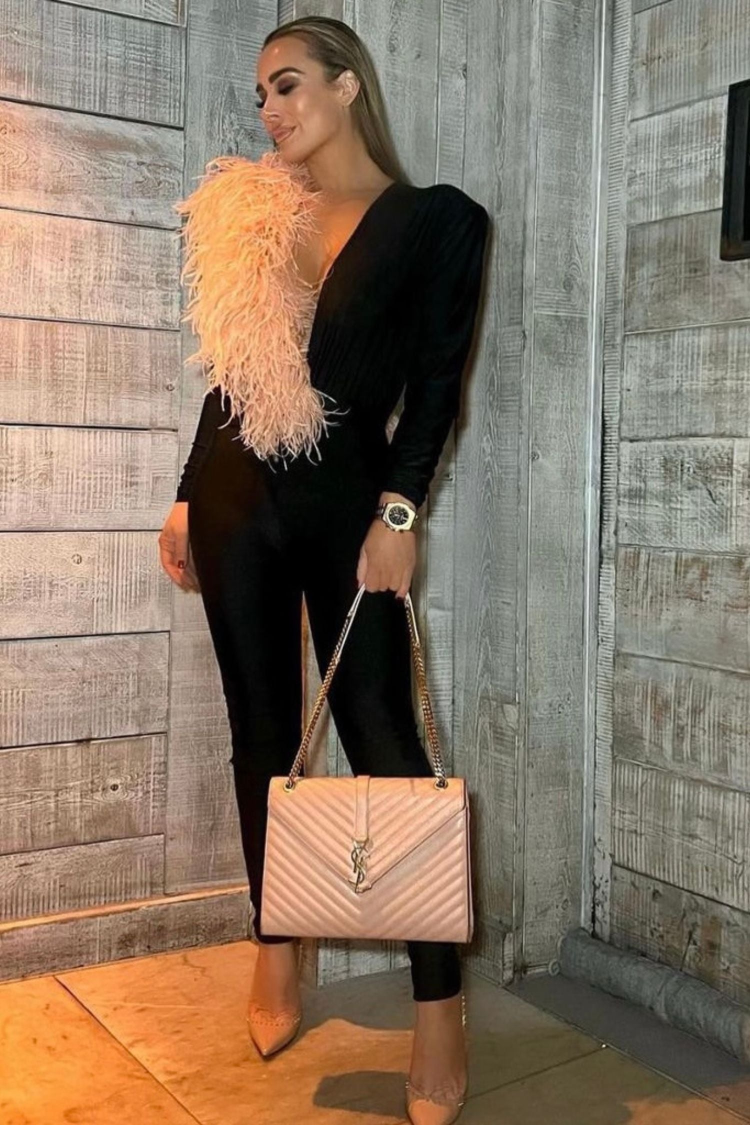 AURA PADDED SHOULDER PLUNGE JUMPSUIT WITH OSTRITCH FEATHER