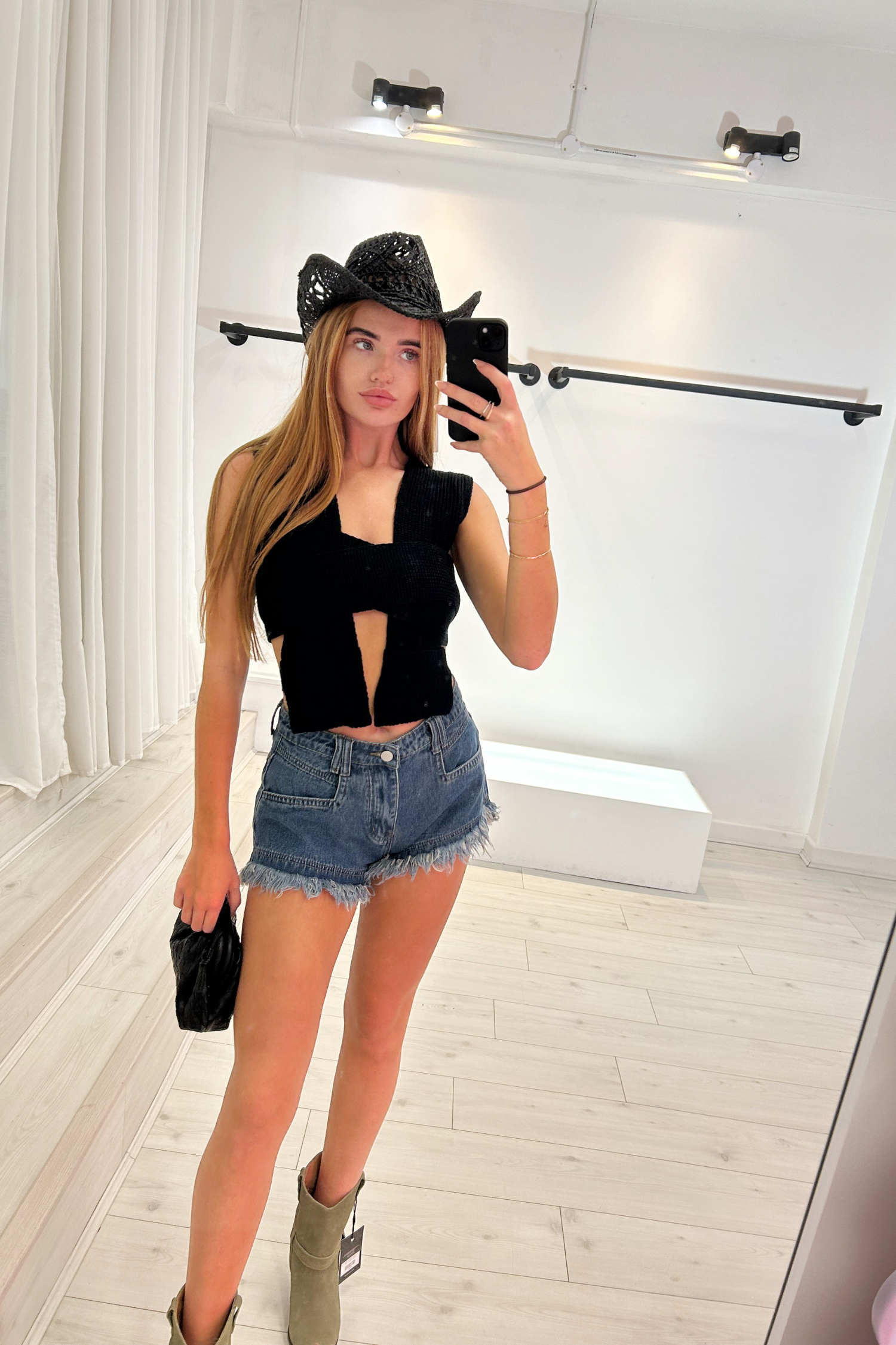 Our Avery Knit Top in Black features a chic, casual design that will flatter all figures. With its flattering black knit tie, this piece adds a touch of modern sophistication to any summer wardrobe. Wear it to brunch with friends or while running errands and always feel stylish.