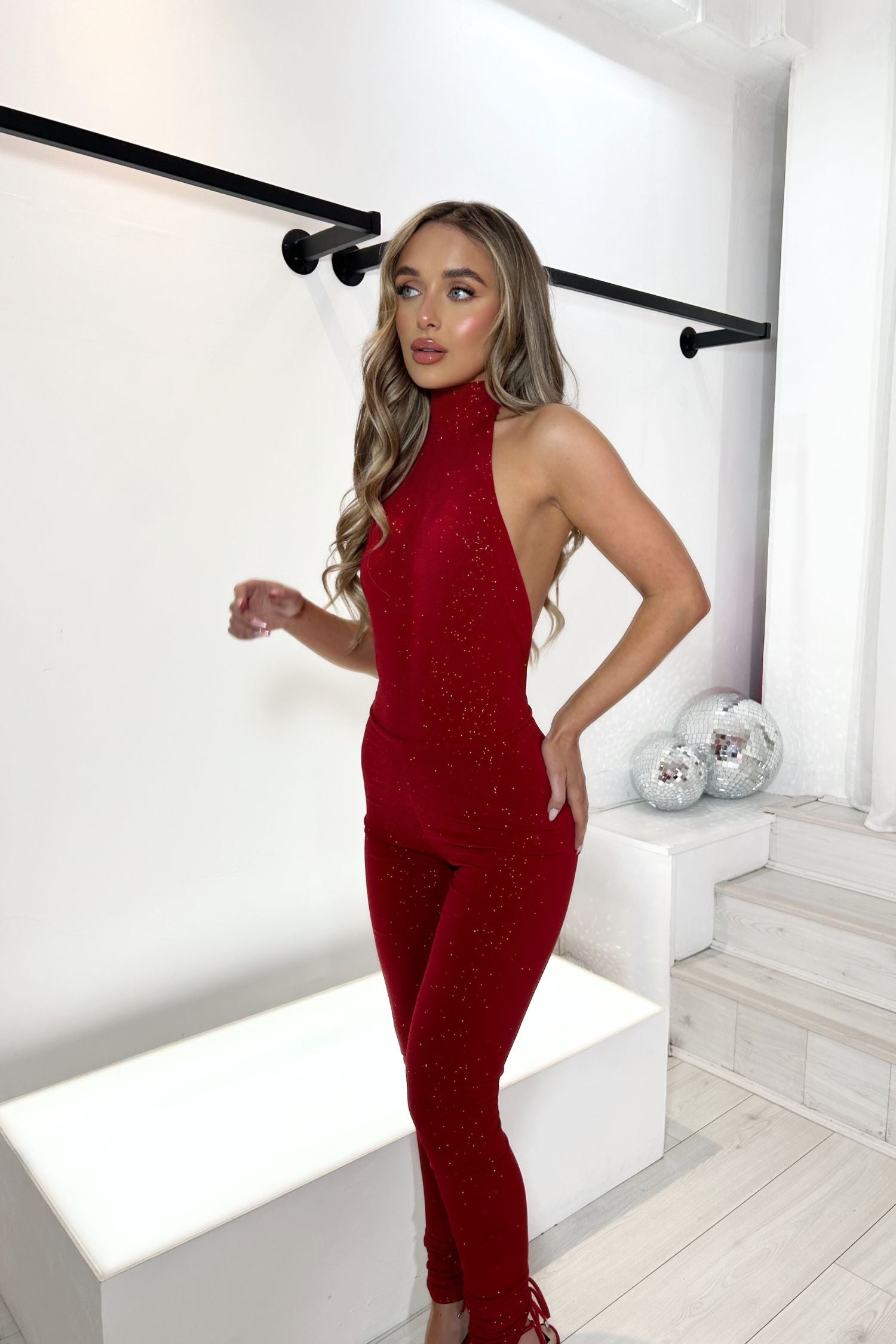 CELIA HALTERNECK BACKLESS JUMPSUIT – RED FINE SPARKLE