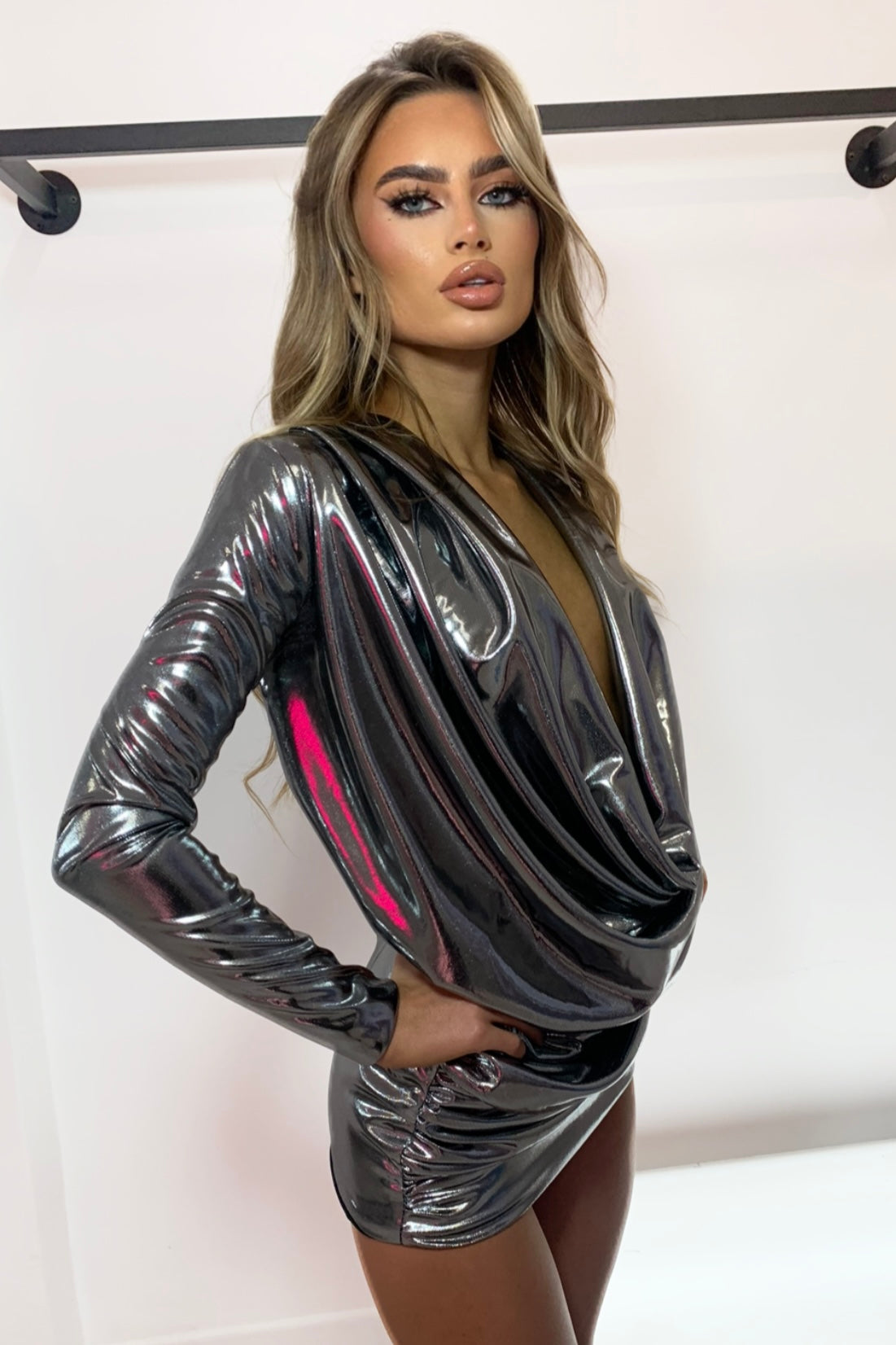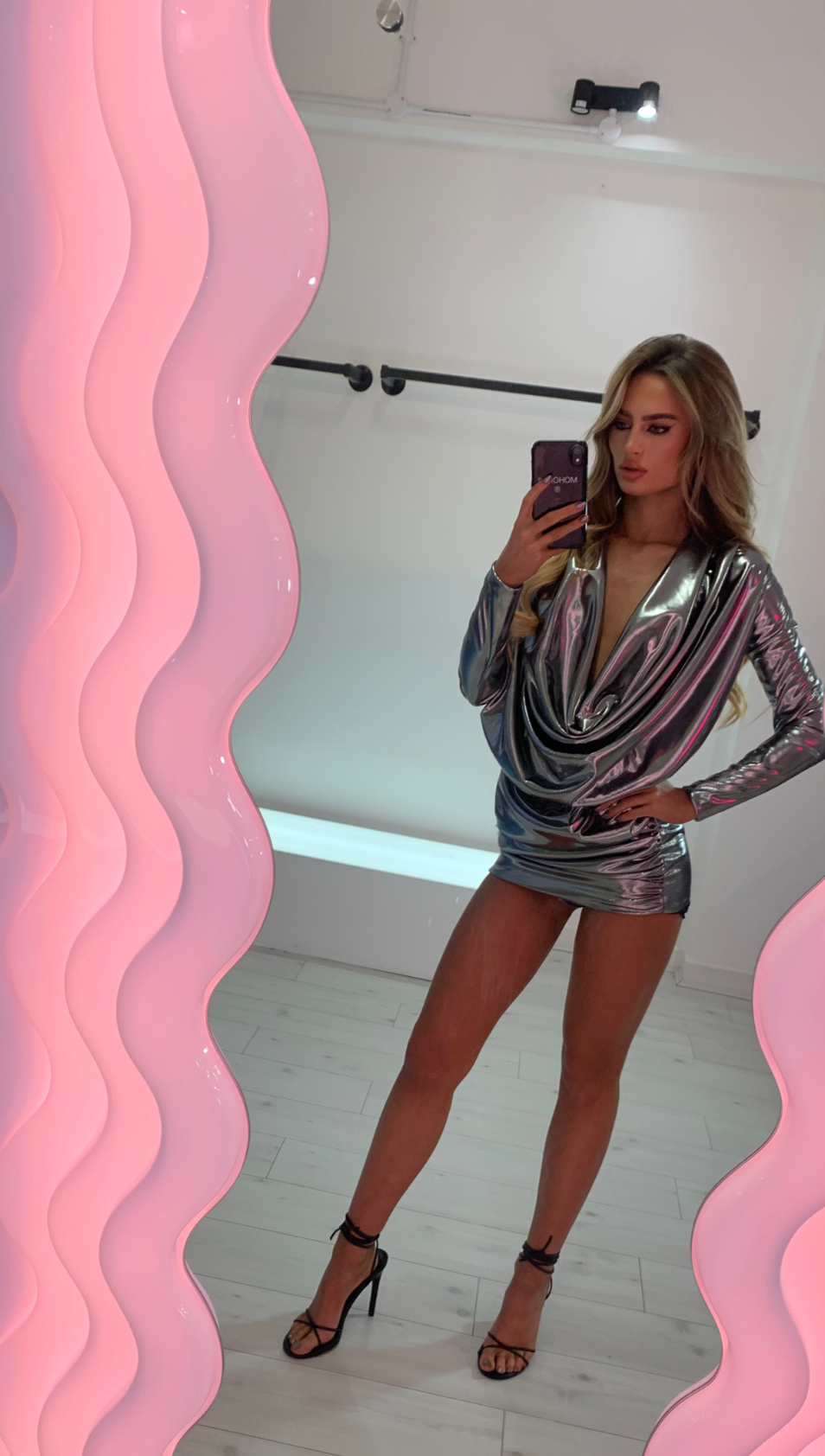 Our stunning deep plunge ANNA mini-dress is back for AW23 in this bold, mirror metallic silver fabric. Featuring strong shoulders, deep plunge, ruching and metallic! Everything we love!