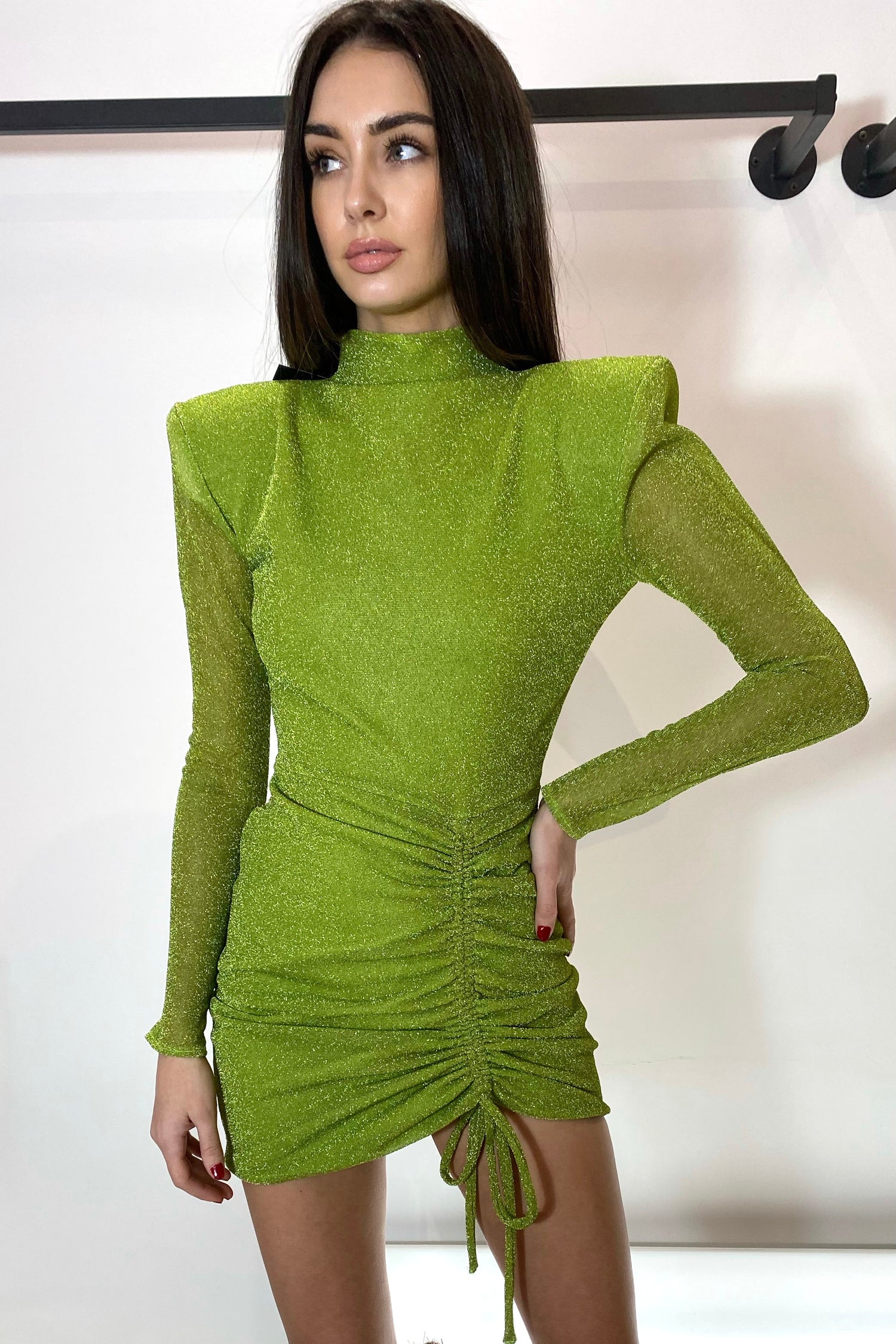The 'DITA' dress features a high neck and bold shoulder pads as well as ruching through the body, strategically placed to flatter.