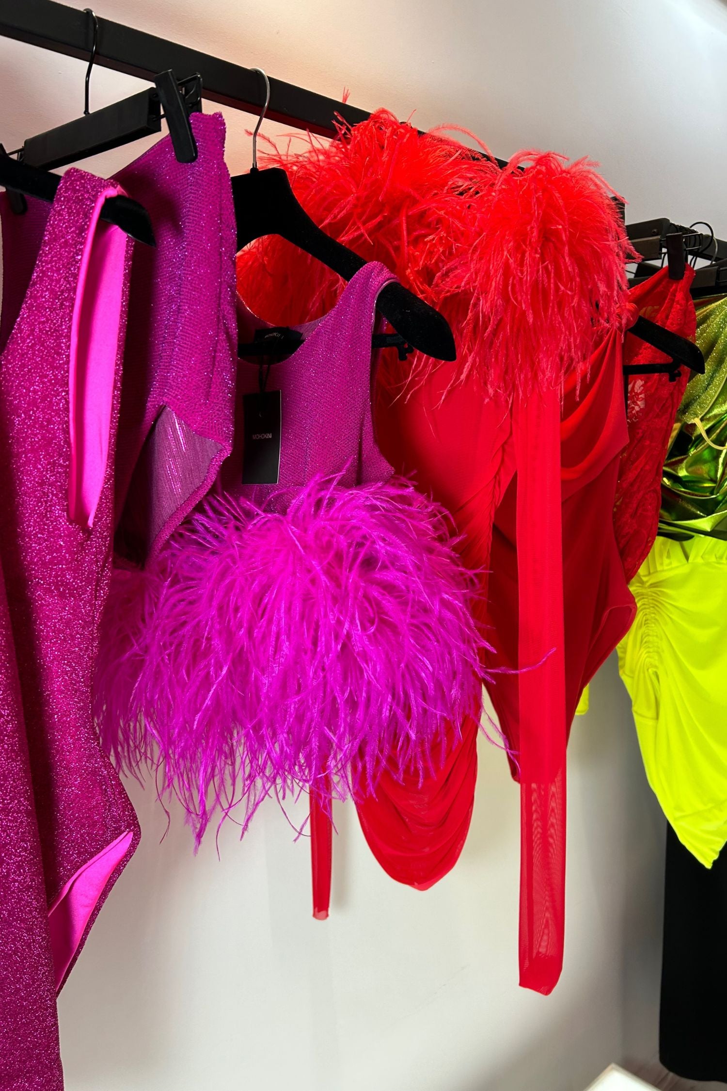 Introducing the elegant LIBERTY FEATHER TRIM TOP, designed with sparkling accents and detailed craftsmanship. This luxurious set features a fully-lined vest. Our feathers are the thickest finest quality custom-made in the U.K. Step out in style this season with a show stopping set you won't find anywhere else. Limited quantities available.