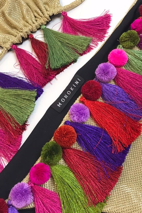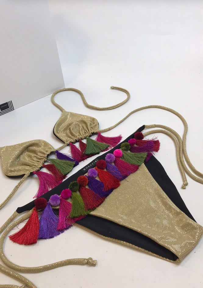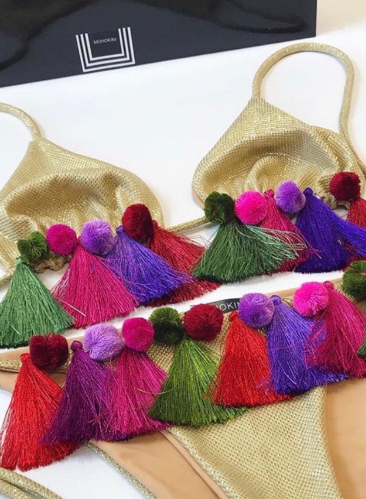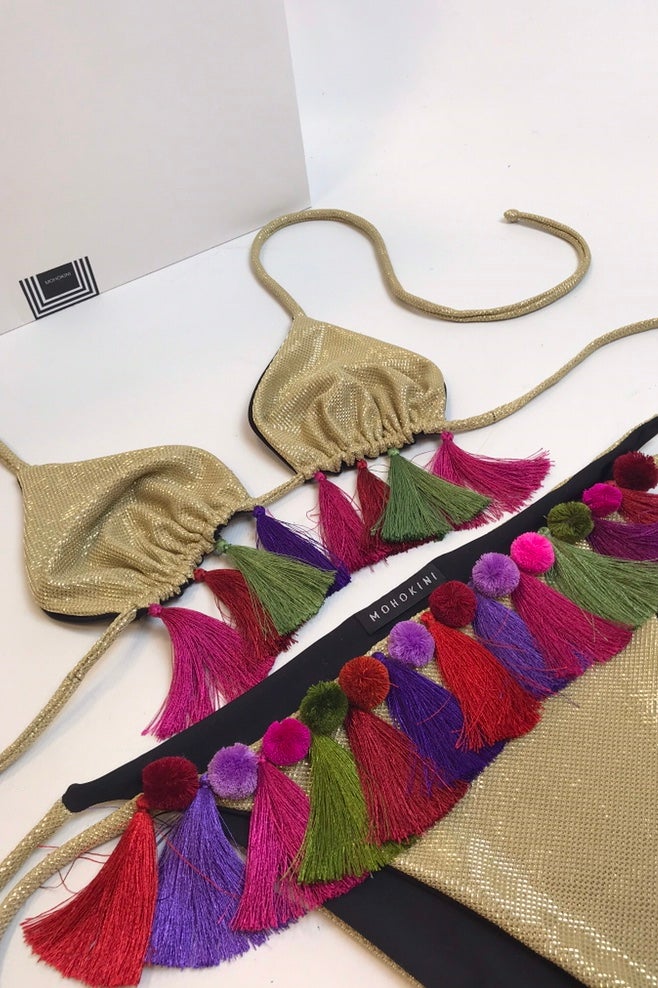 We are just in love with this new bikini! A boho inspired finish featuring premium handmade rainbow silk tassels and pom-poms, all made by the hill-tribe people of the mountains of northern Thailand.