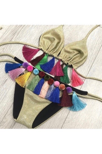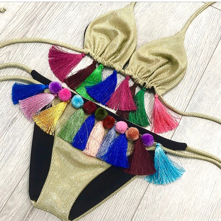 We are just in love with our new bikini! A boho inspired finish featuring premium handmade rainbow silk tassels and pom-poms, all made by the hill-tribe people of the mountains of northern Thailand.