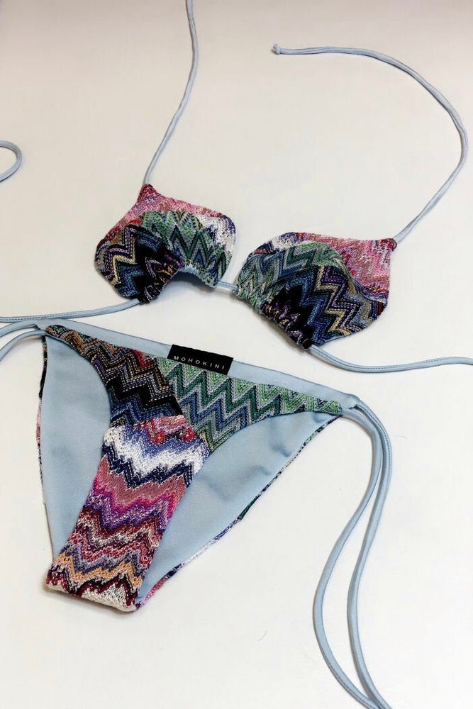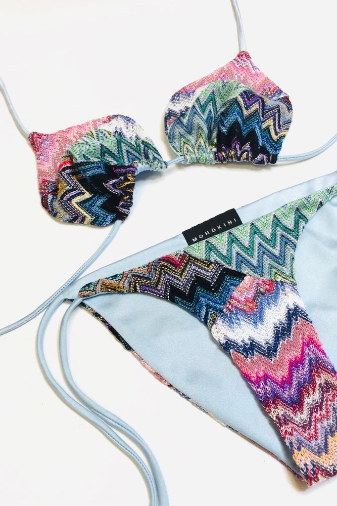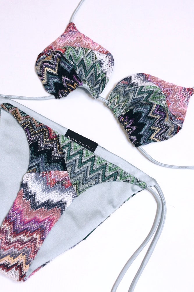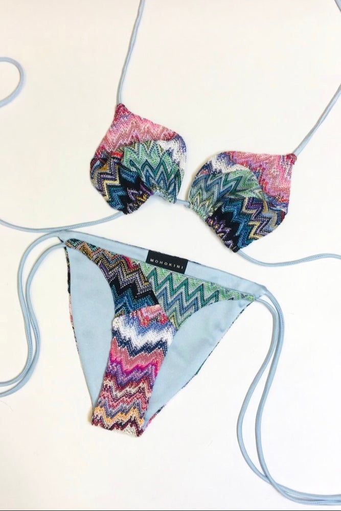 The FLORA bikini is a simple triangle style that is sure to be a stand out at the beach in this patchwork crochet knit print.