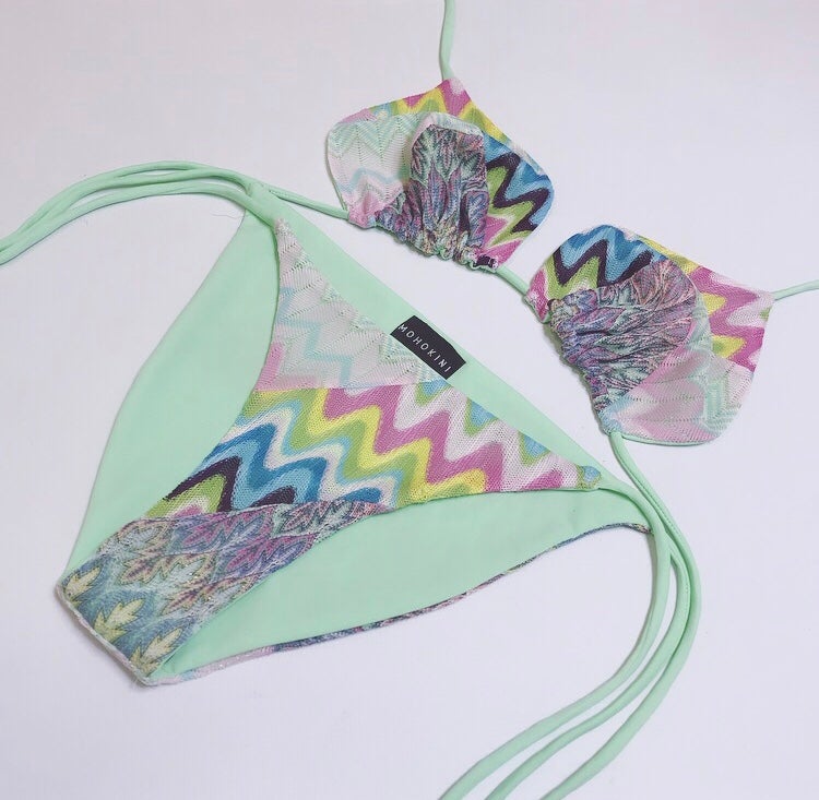 Limited edition - be the only one! The FLORA bikini is a simple triangle style that is sure to stand out at the beach with this patchwork crochet knit print. Its adjustable side straps ensure the perfect fit which can be paired with matching trousers, shorts or cover up to establish the perfect poolside look. If you require a different size top to bottoms please write this in the notes at checkout. - Crochet knit - Hand wash - Fits true to size - Low rise briefs with medium coverage - If you wear a D cup or above you may prefer to take the next size up in your bikini top