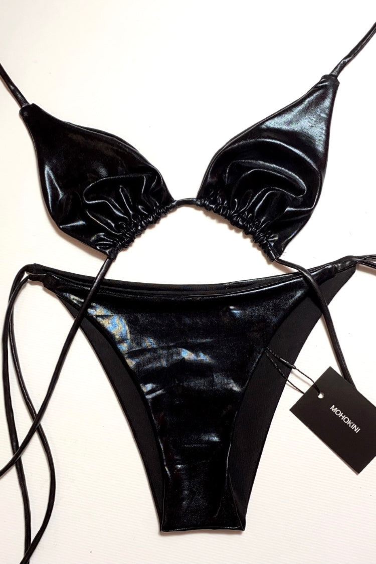Make a bold statement and exude confidence at the beach in our FLORA bikini crafted in black SHEEN - shiny leather-like fabric