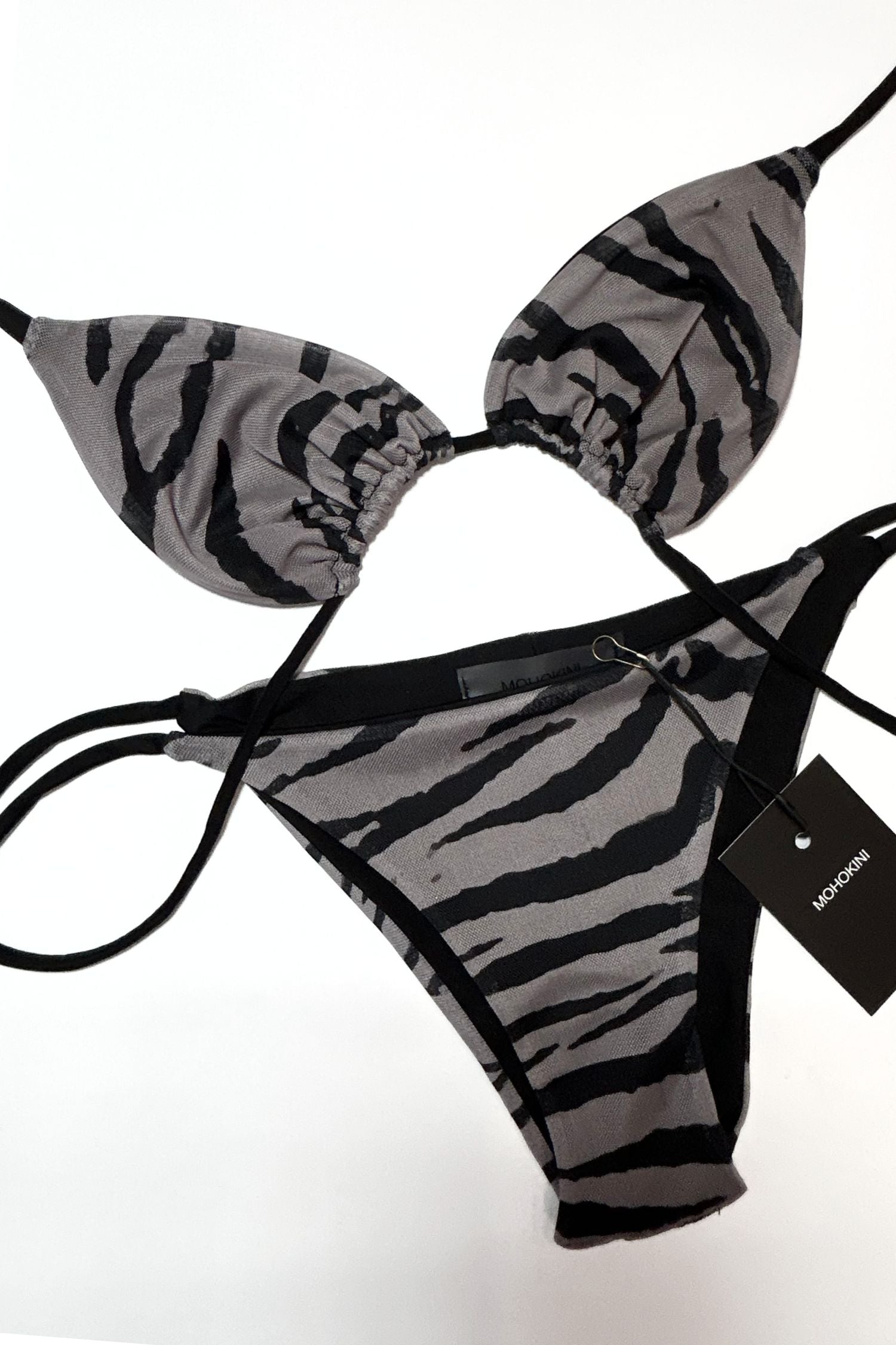 Introducing our FLORA TRIANGLE BIKINI in new GREY TIGER PRINT. This clasic triangle tie side bikini offers both style and comfort in one stunning piece. Make a statement and stand out from the crowd.