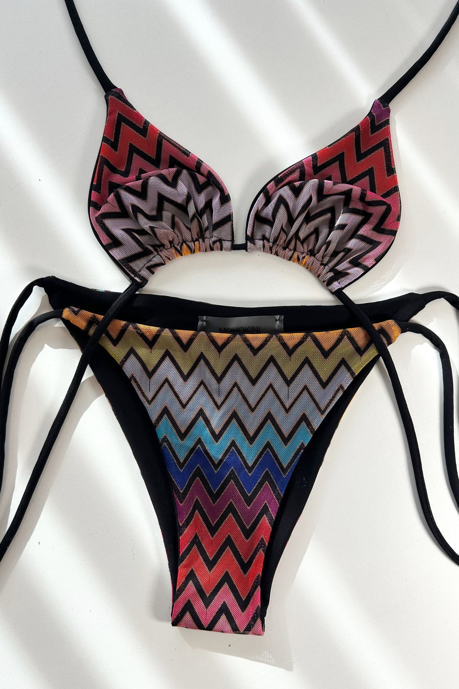 Crafted in a bold multi-coloured zigzag fabric inspired by Italian coastlines, this set channels laid-back glamour with a touch of retro flair. The classic triangle top and tie-side bottoms offer a flattering, adjustable fit designed to accentuate your shape while keeping it timeless.