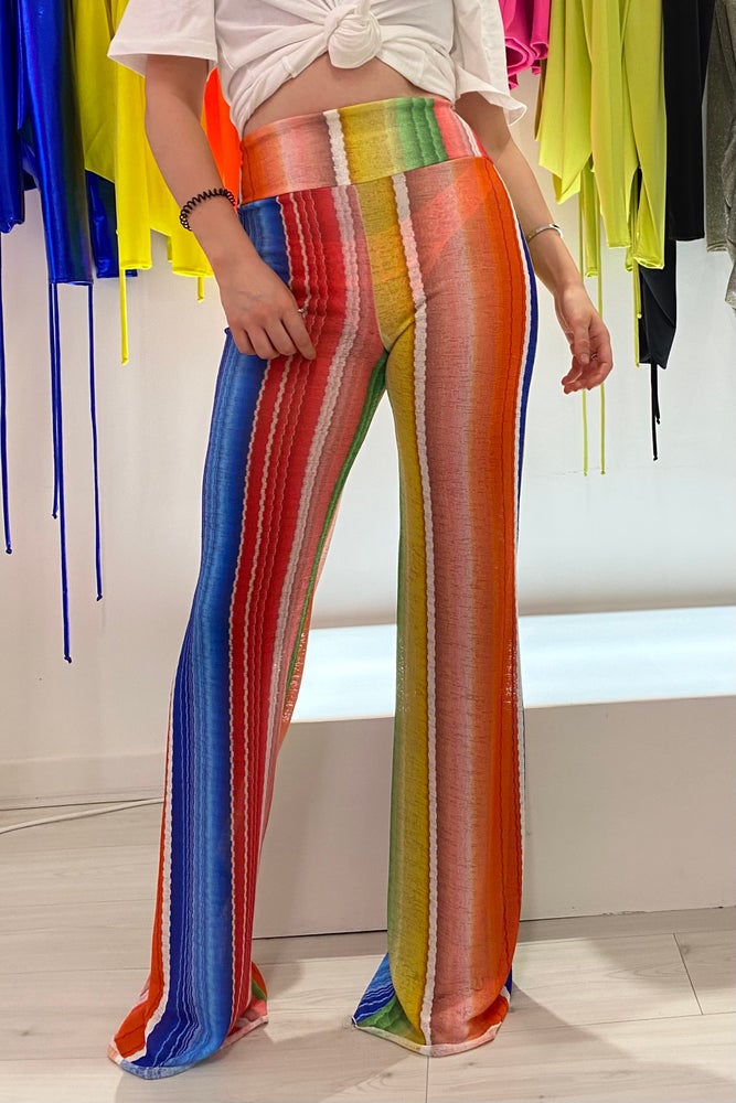 Put your jeans away for a day! Introducing our HALLIE wide leg trousers. Featuring an elasticated waistband for comfort. Simple but sleek flared trousers in this bold and eye catching colour way. Wear to the beach, Dress up with a pair of platforms for a 70s inspired look or down with some crisp white trainers for more of cool and minimal look
