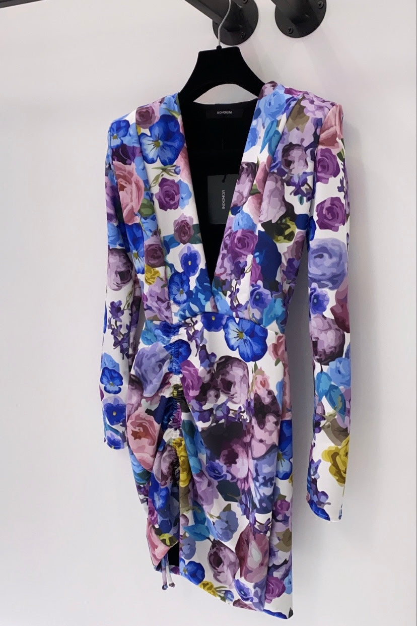HEIDI DEEP PLUNGE SHOULDER PAD FLORAL MINI DRESS - AZALEA
