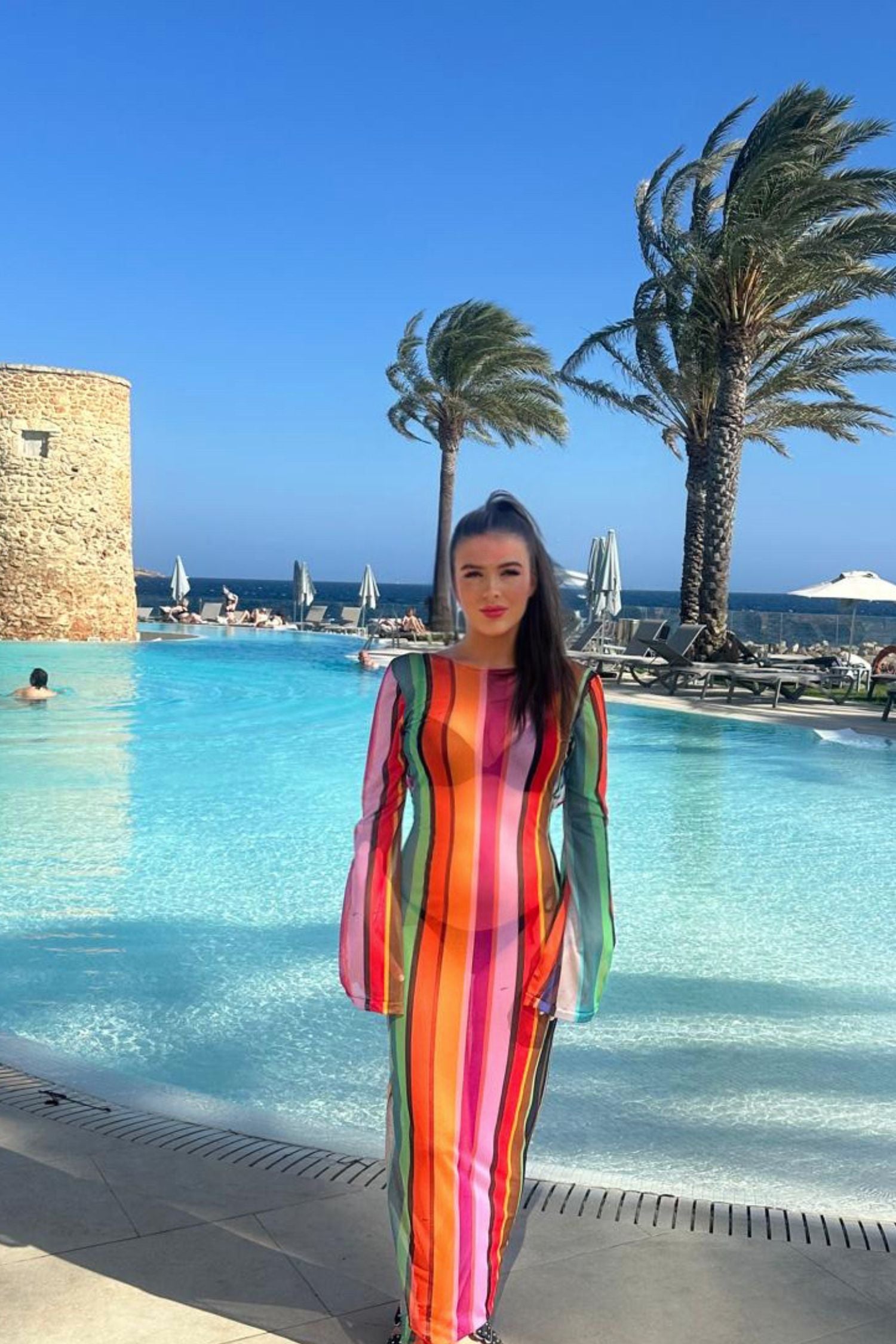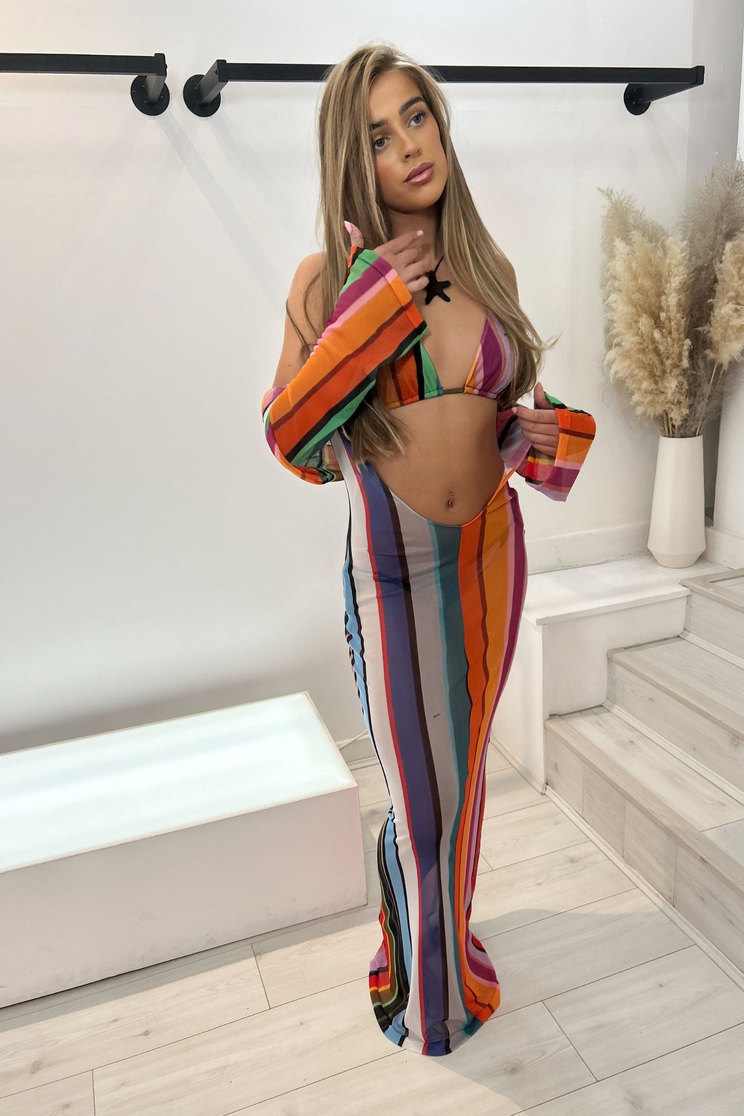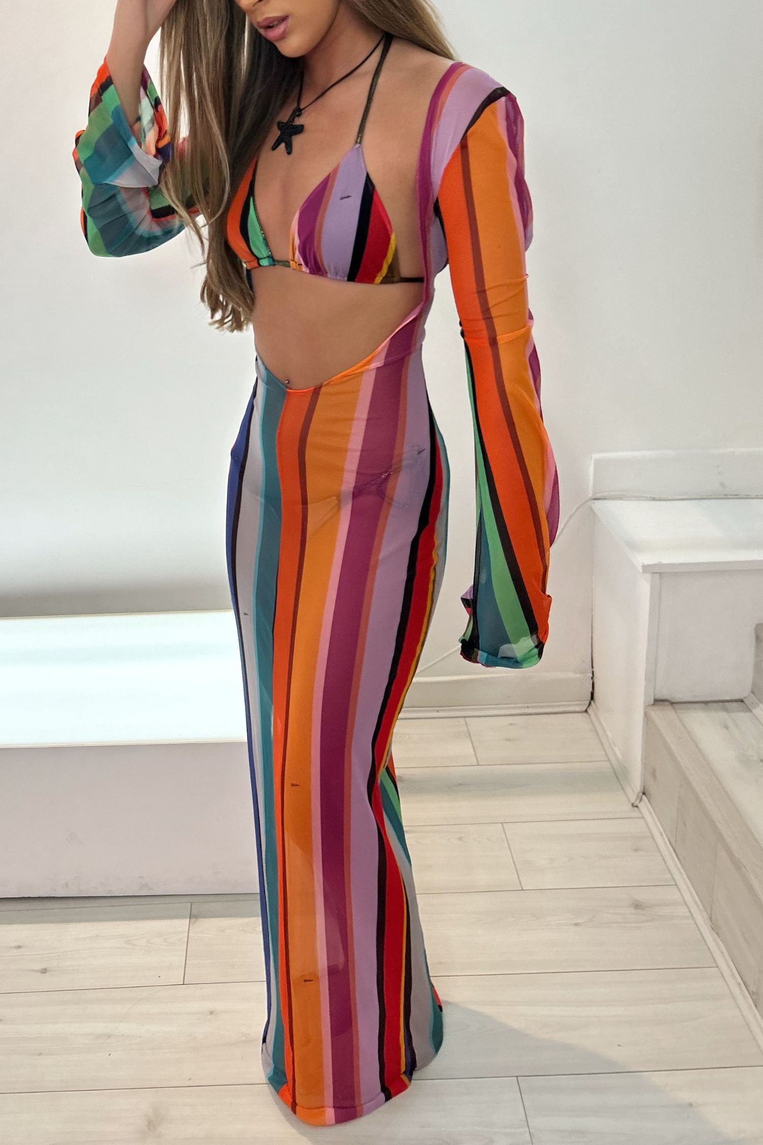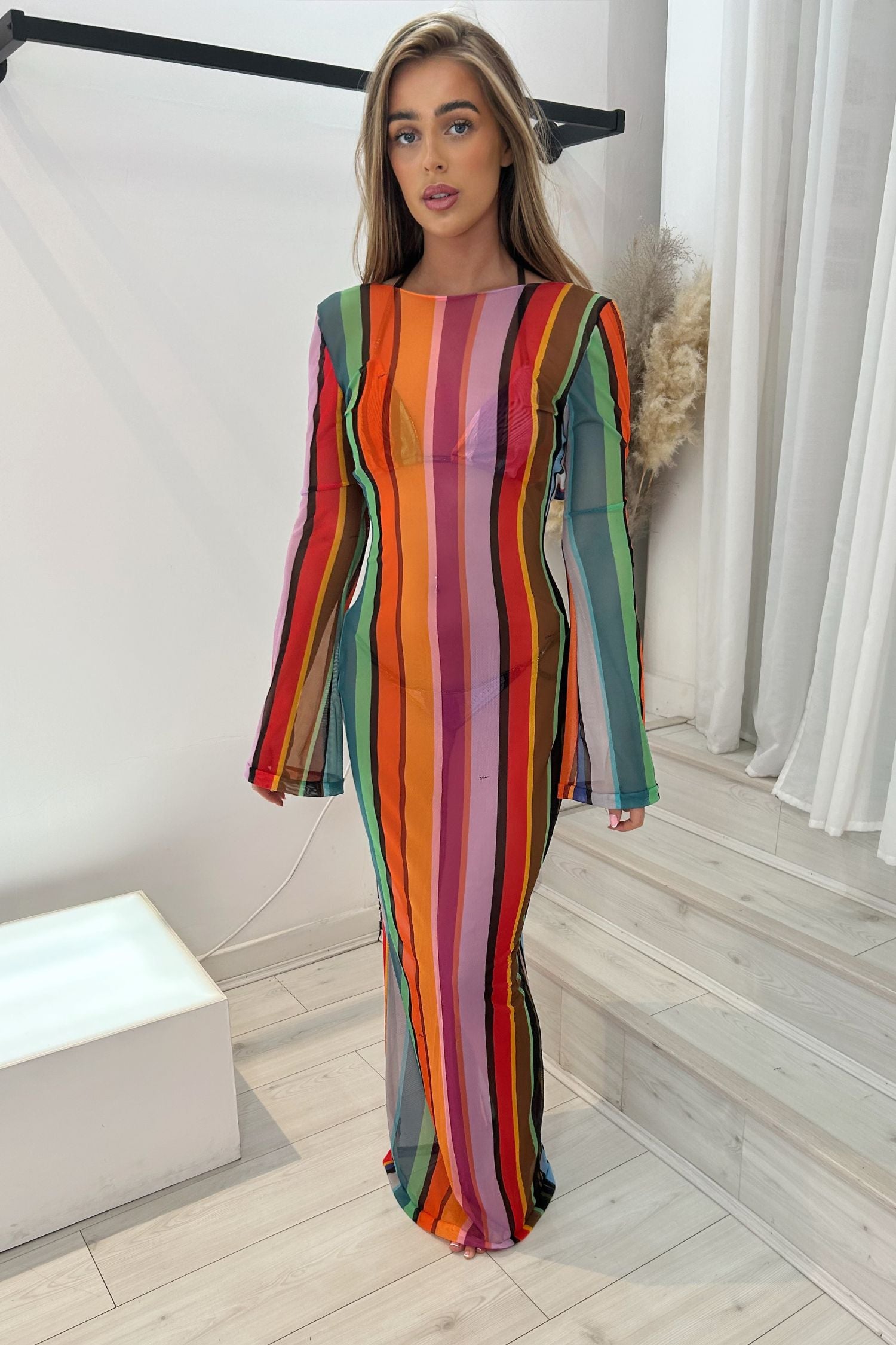 This backless dress with a colourful stripe pattern is perfect for your next seaside holiday
