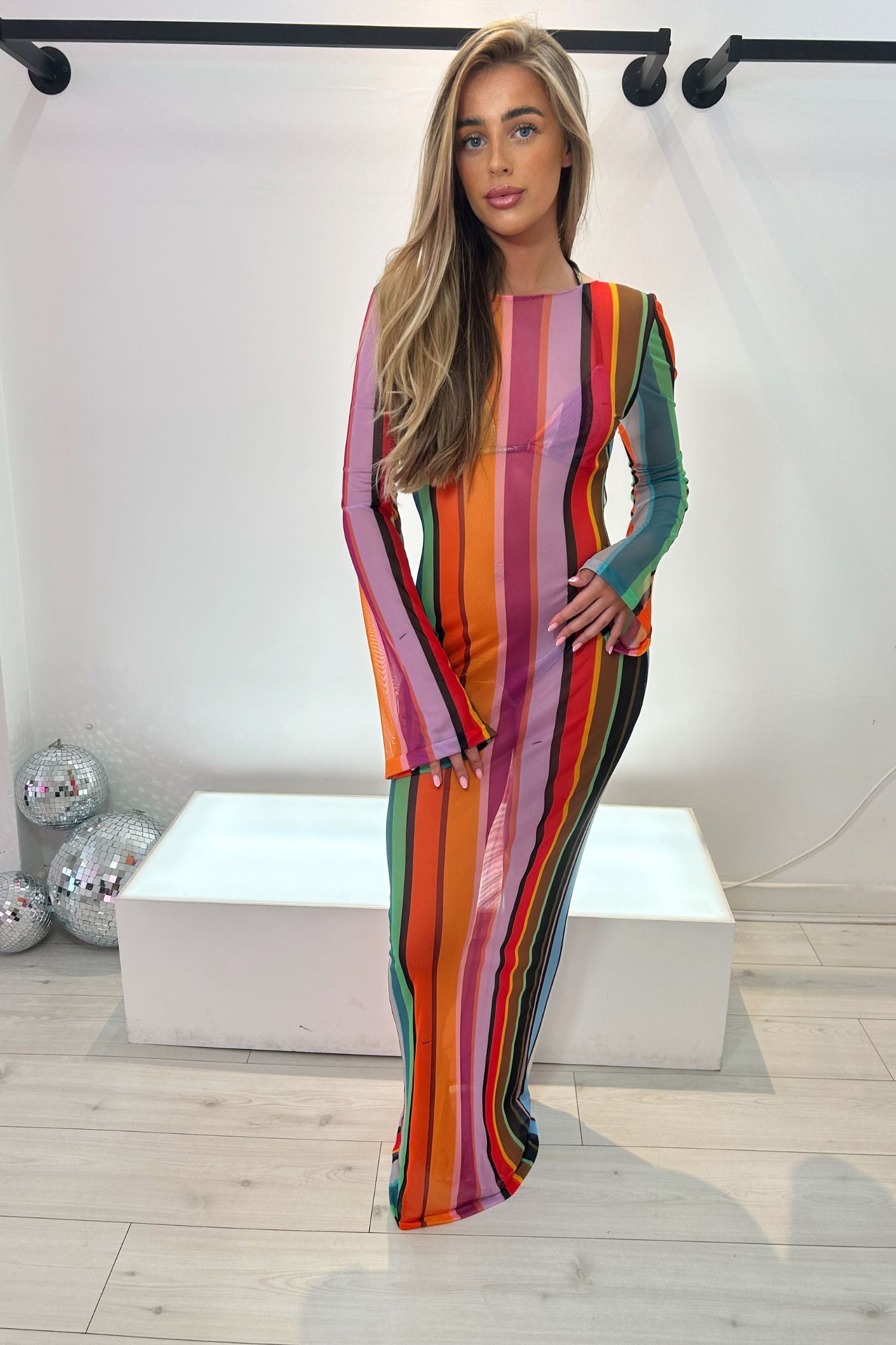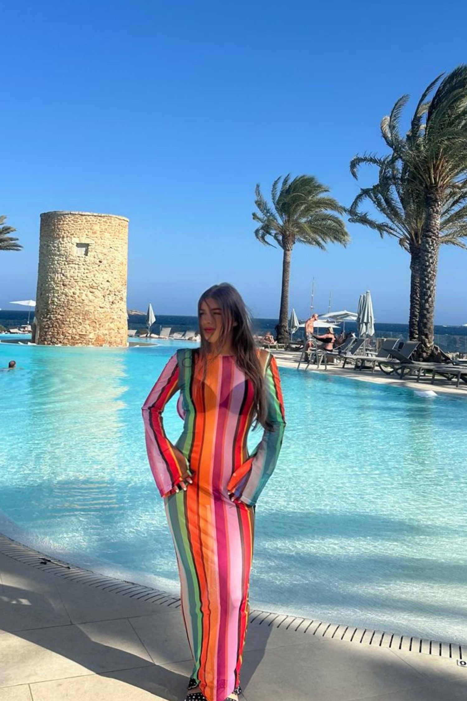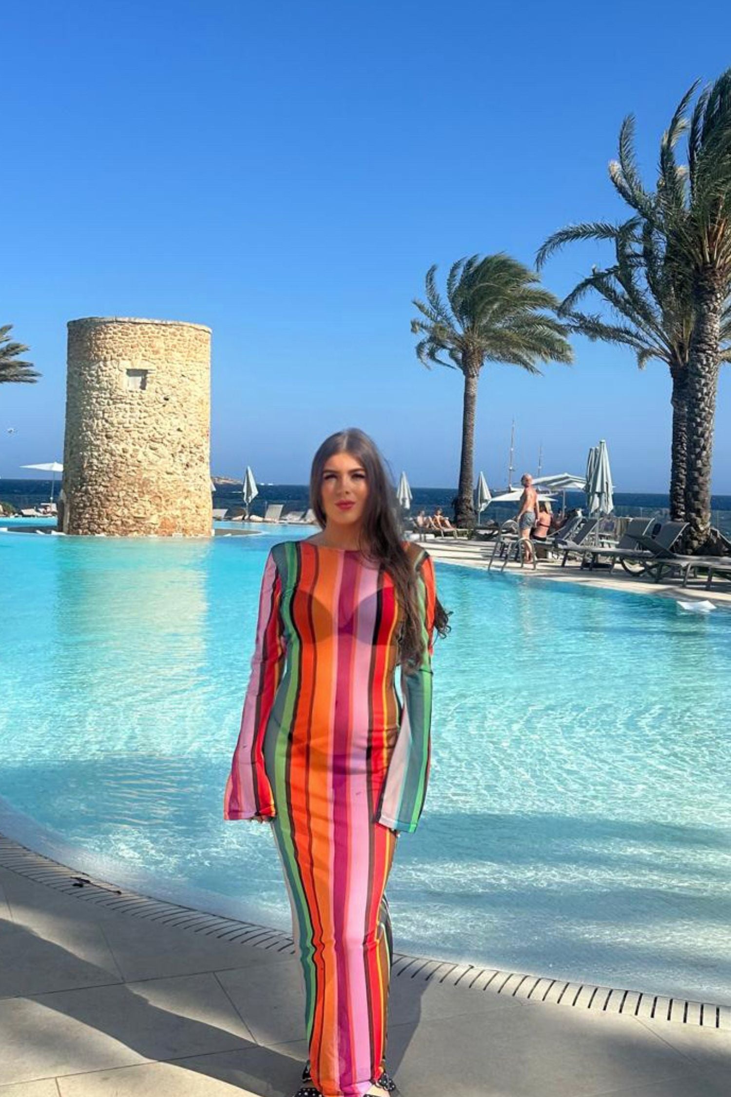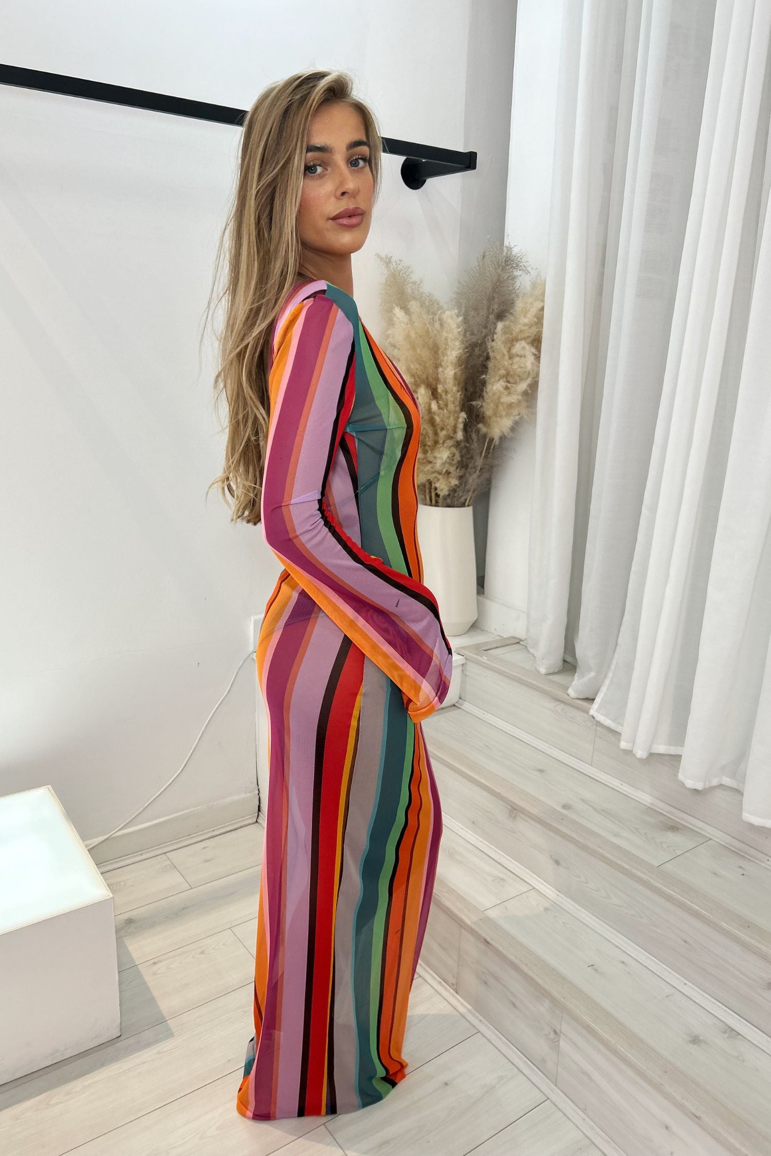 This backless dress with a colourful stripe pattern is perfect for your next seaside holiday