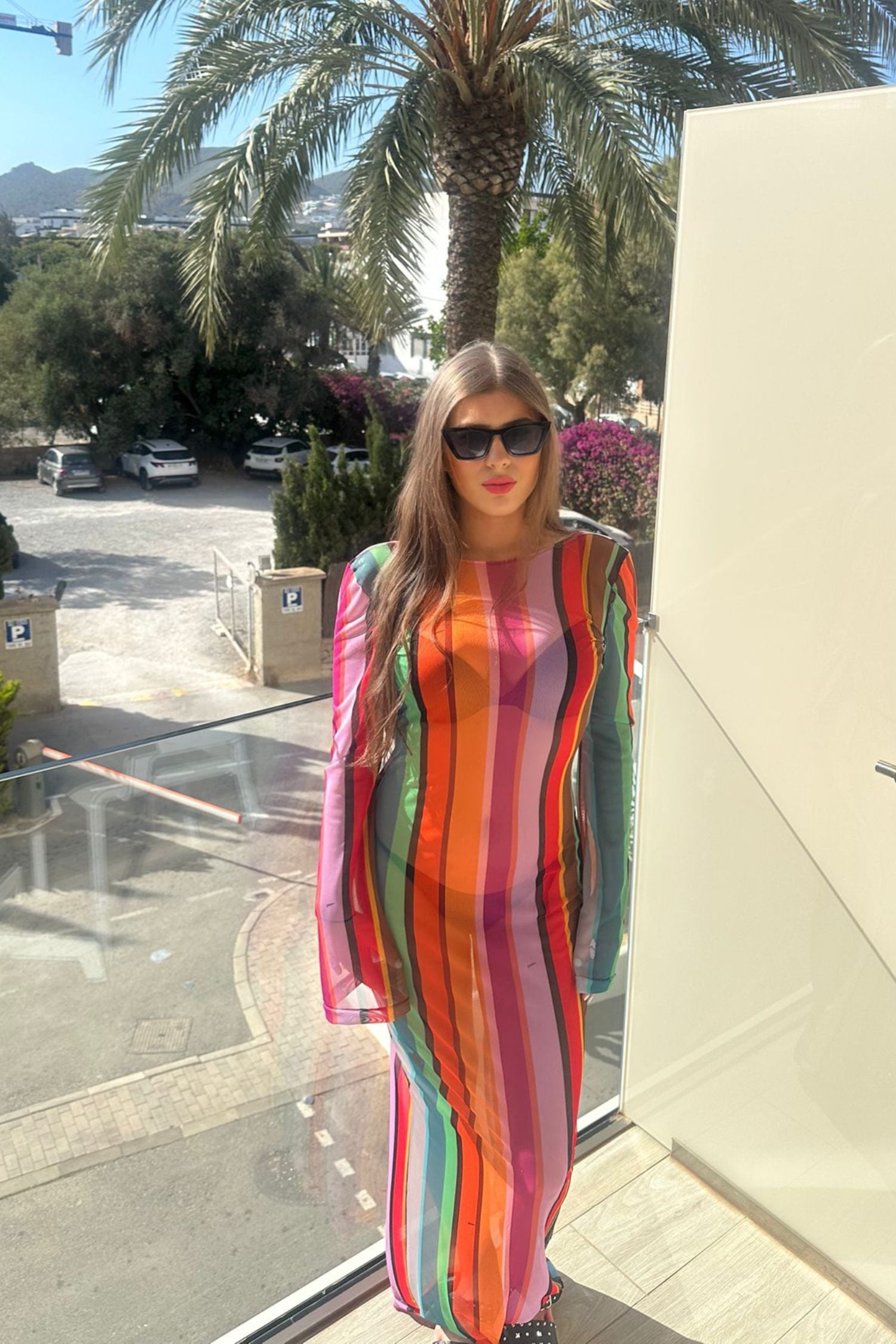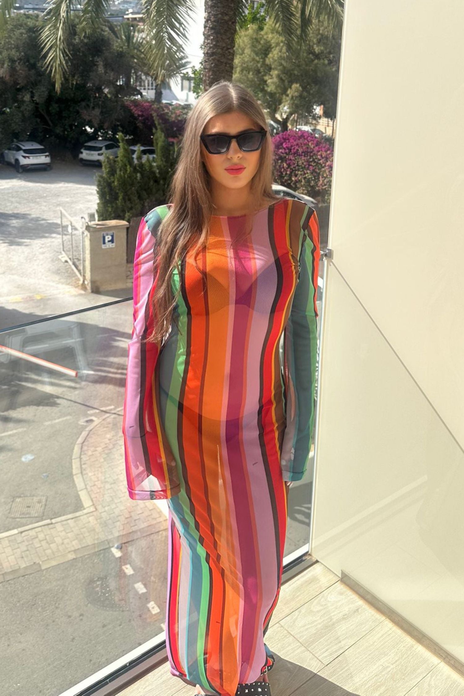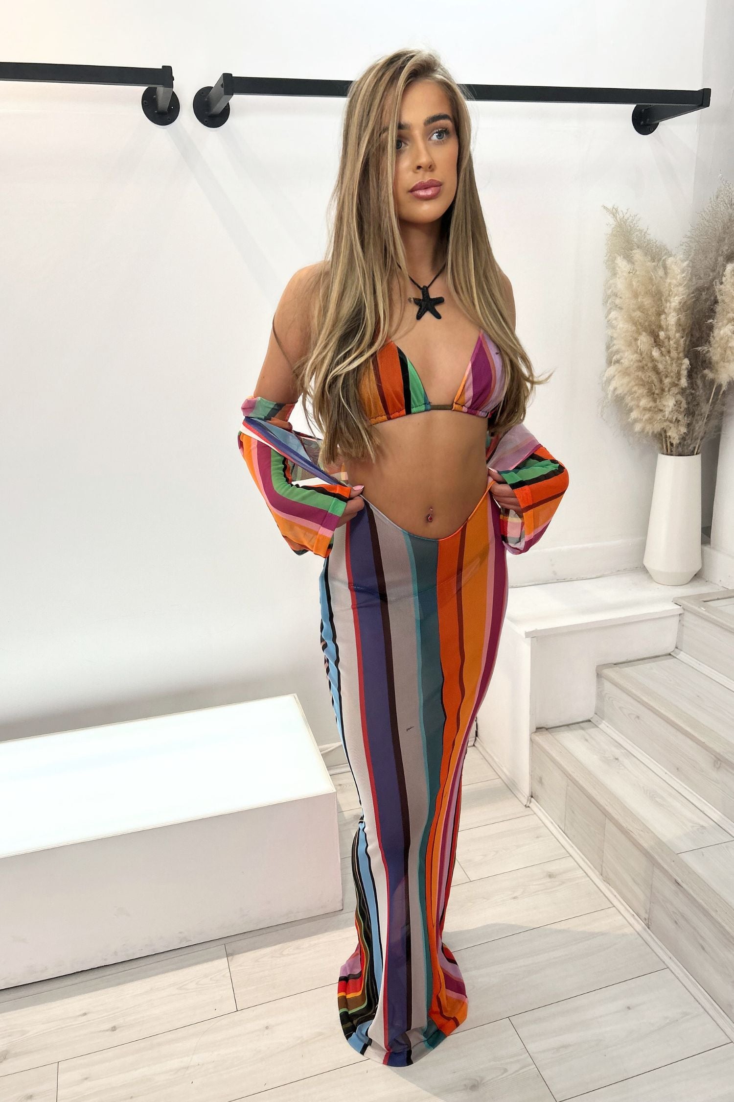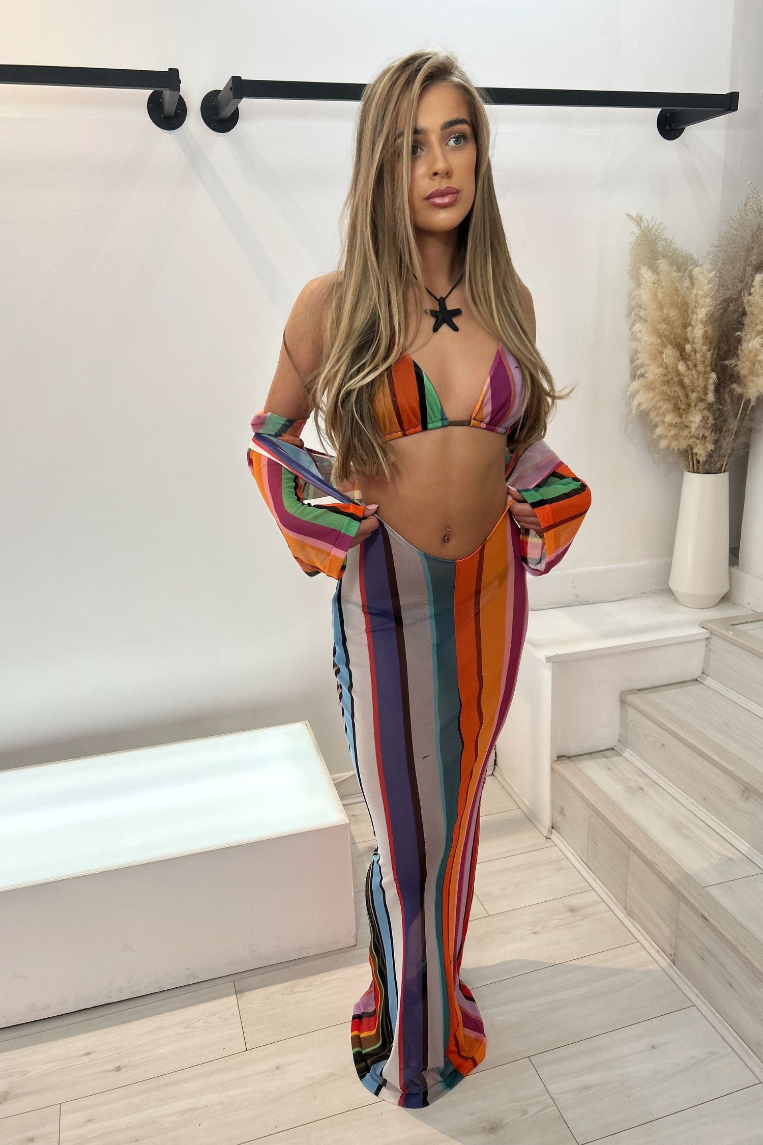 This backless dress with a colourful stripe pattern is perfect for your next seaside holiday