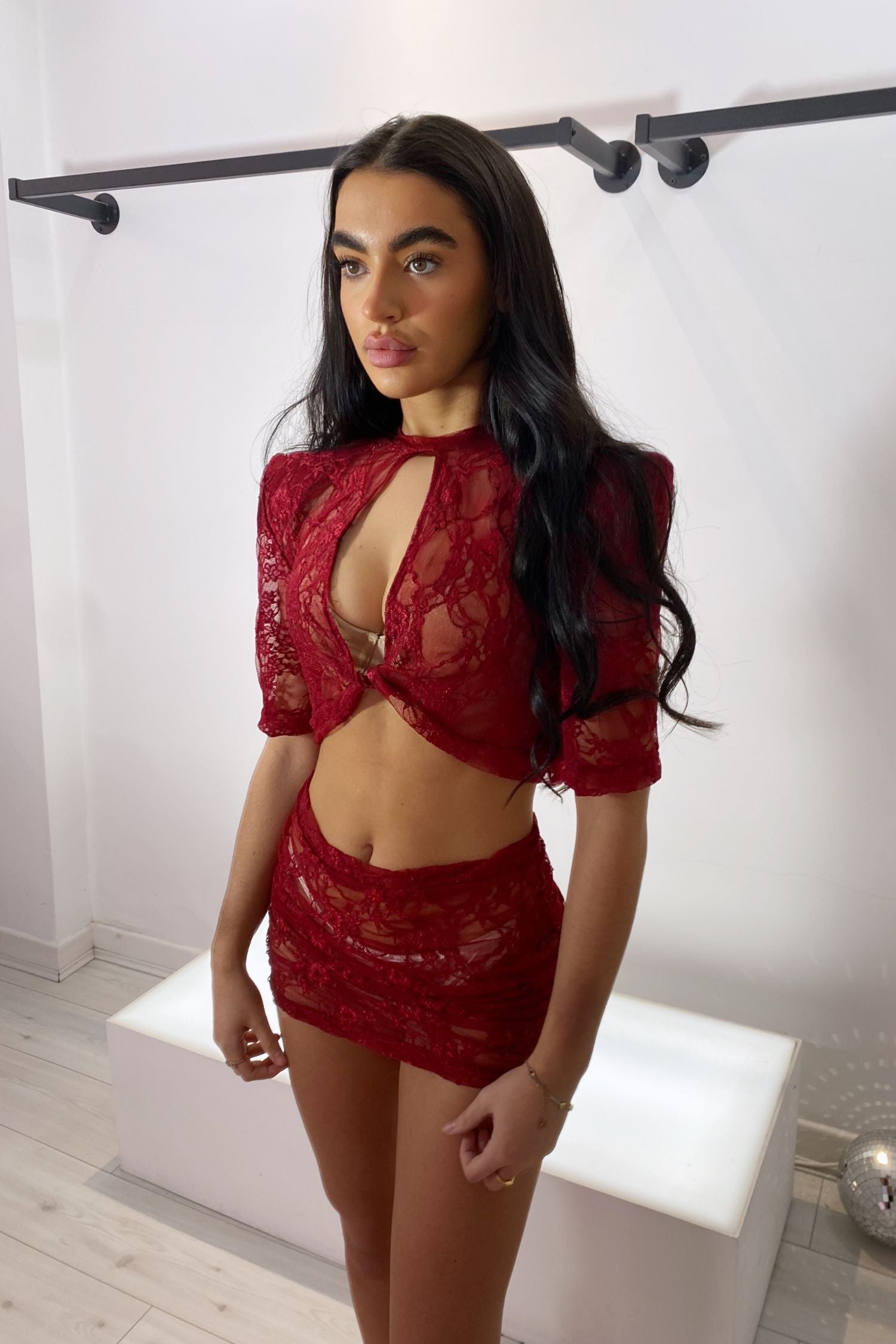 Sexy, sophisticated, and effortlessly chic — the Lavinia Wine Lace top and skirt co-ord is the ultimate holiday essential. Featuring a delicate stretch lace fabric that hugs your curves in all the right places, with a flattering twist-front crop top and matching high-waisted skirt, this set is made for golden hour cocktails, beach clubs, and late-night plans.