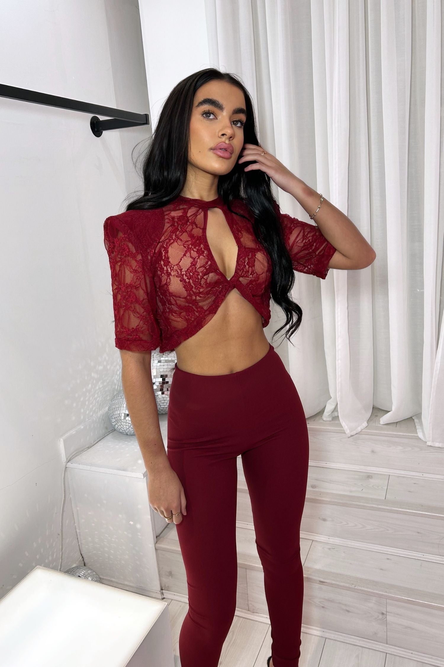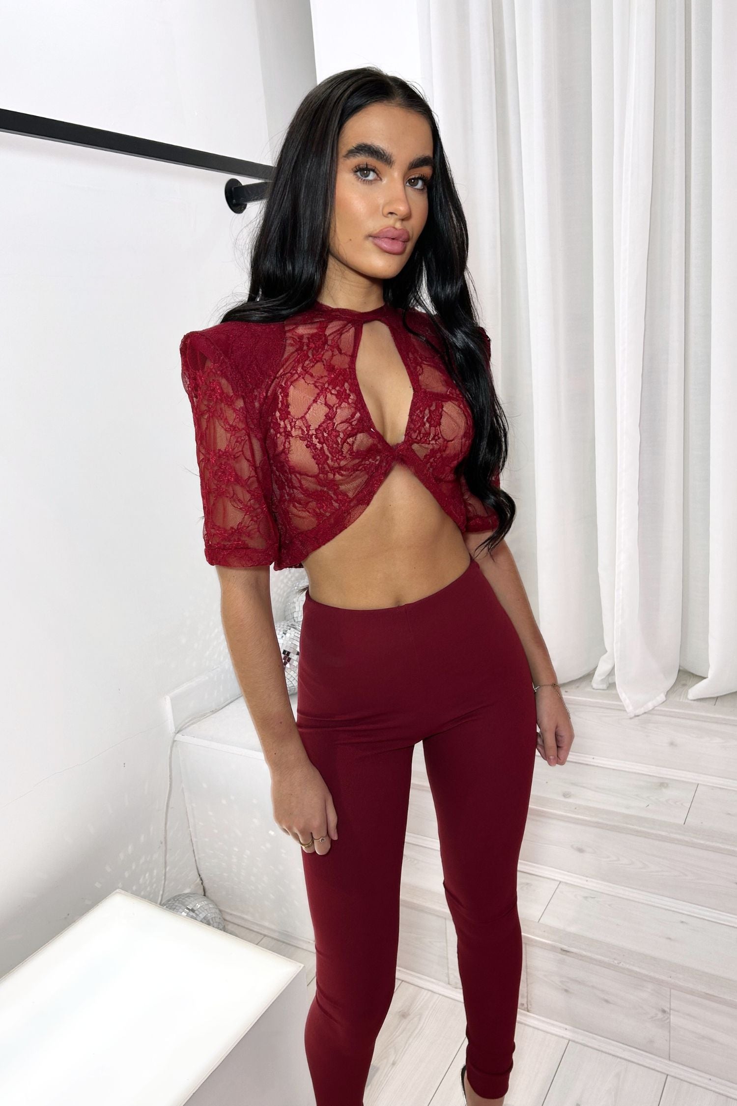 LAVINIA X STELLA PADDED SHOULDER TWIST DETAIL TOP AND HIGH WAIST LEGGINGS CO-ORD - BURGUNDY