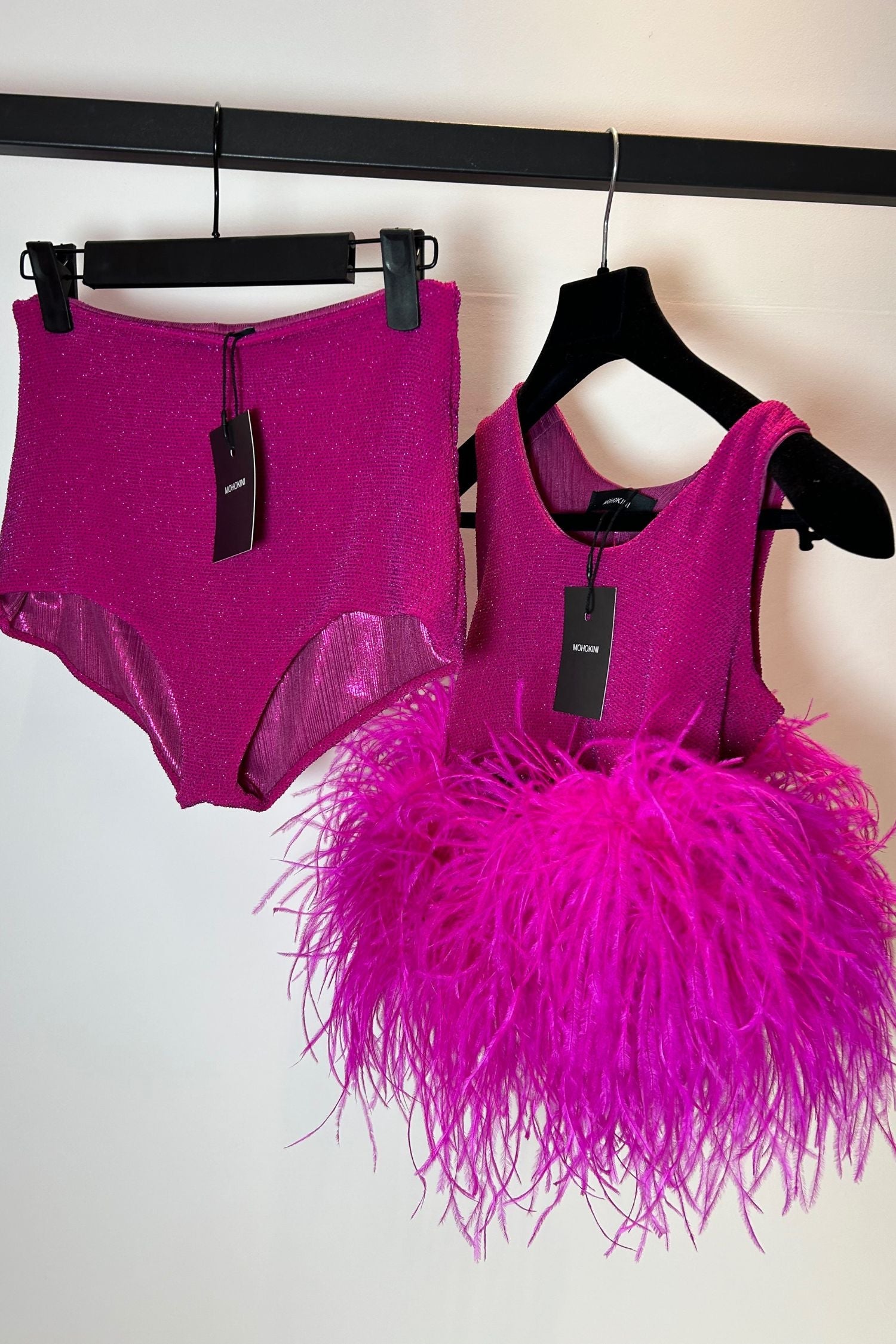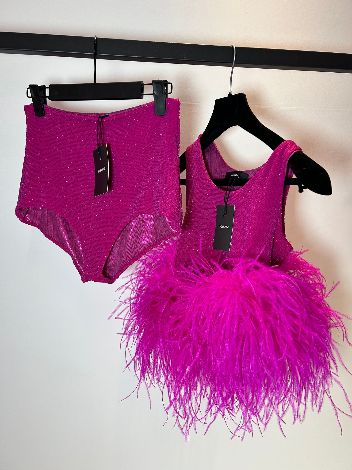 Introducing the elegant LIBERTY FEATHER TRIM CO-ORD, designed with sparkling accents and detailed craftsmanship. This luxurious set features a fully-lined vest and matching nicker shorts. Our feathers the finest quality and  are custom-made in the U.K. Step out in style this season with a show stopping set you won't find anywhere else. Limited quantities available.