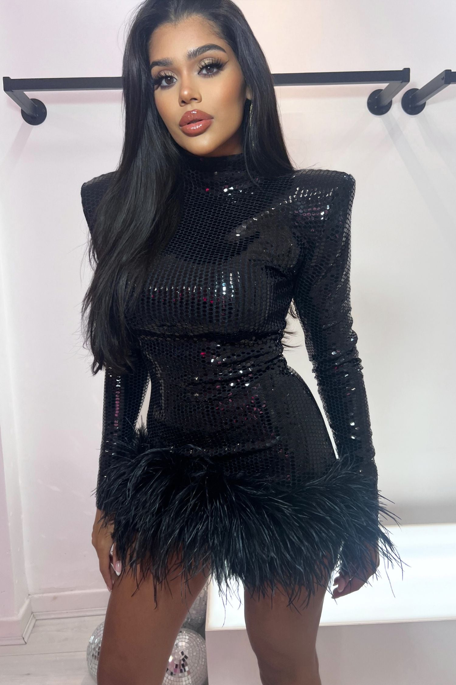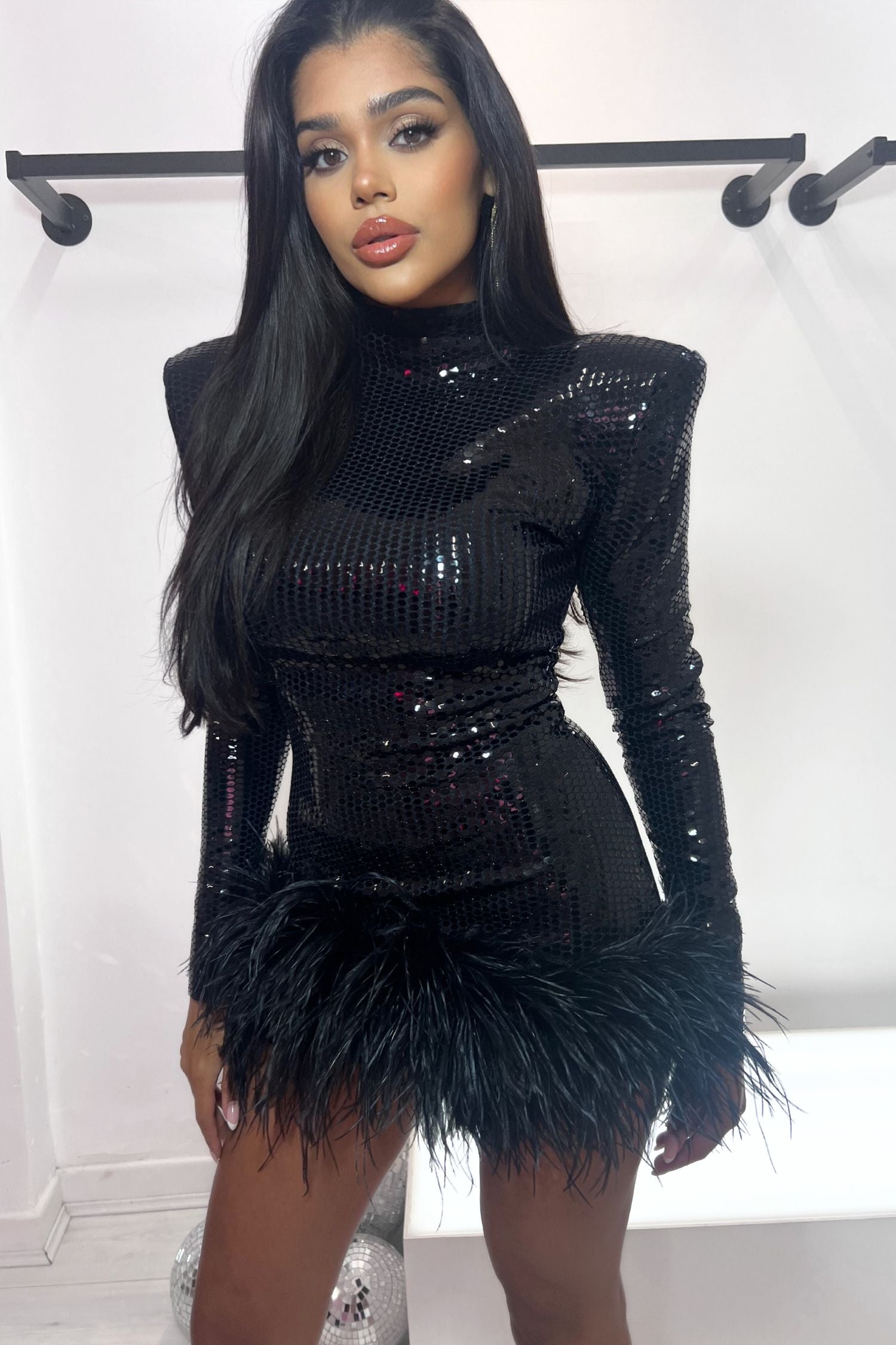 MILEY LONG SLEEVE HIGH NECK MINI DRESS - WET LOOK BLACK SEQUIN & FEATHER