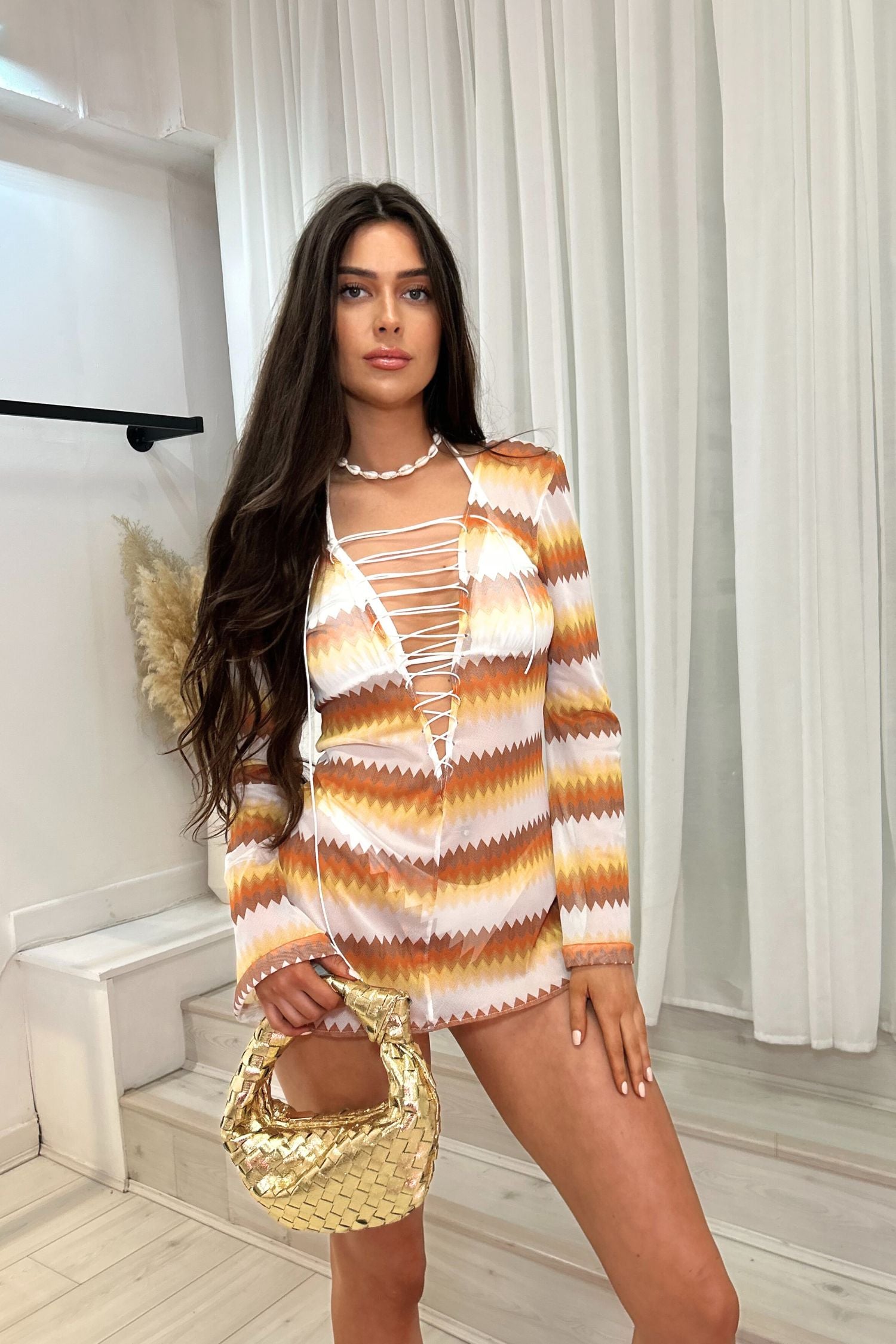 This unique OMAROSA LACE UP MINI DRESS is crafted from an exquisite lemon ombre mesh fabric, creating an undeniably chic look. With its lace-up detail, this dress embodies a feeling of sophistication and exclusivity. Perfect for making a statement. This piece is sure to be a luxurious addition to any wardrobe.