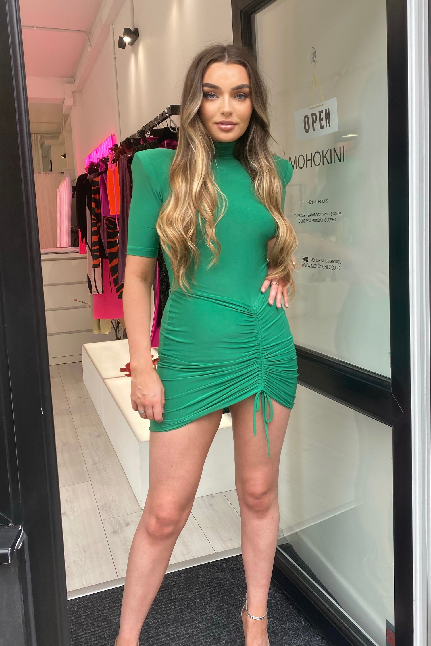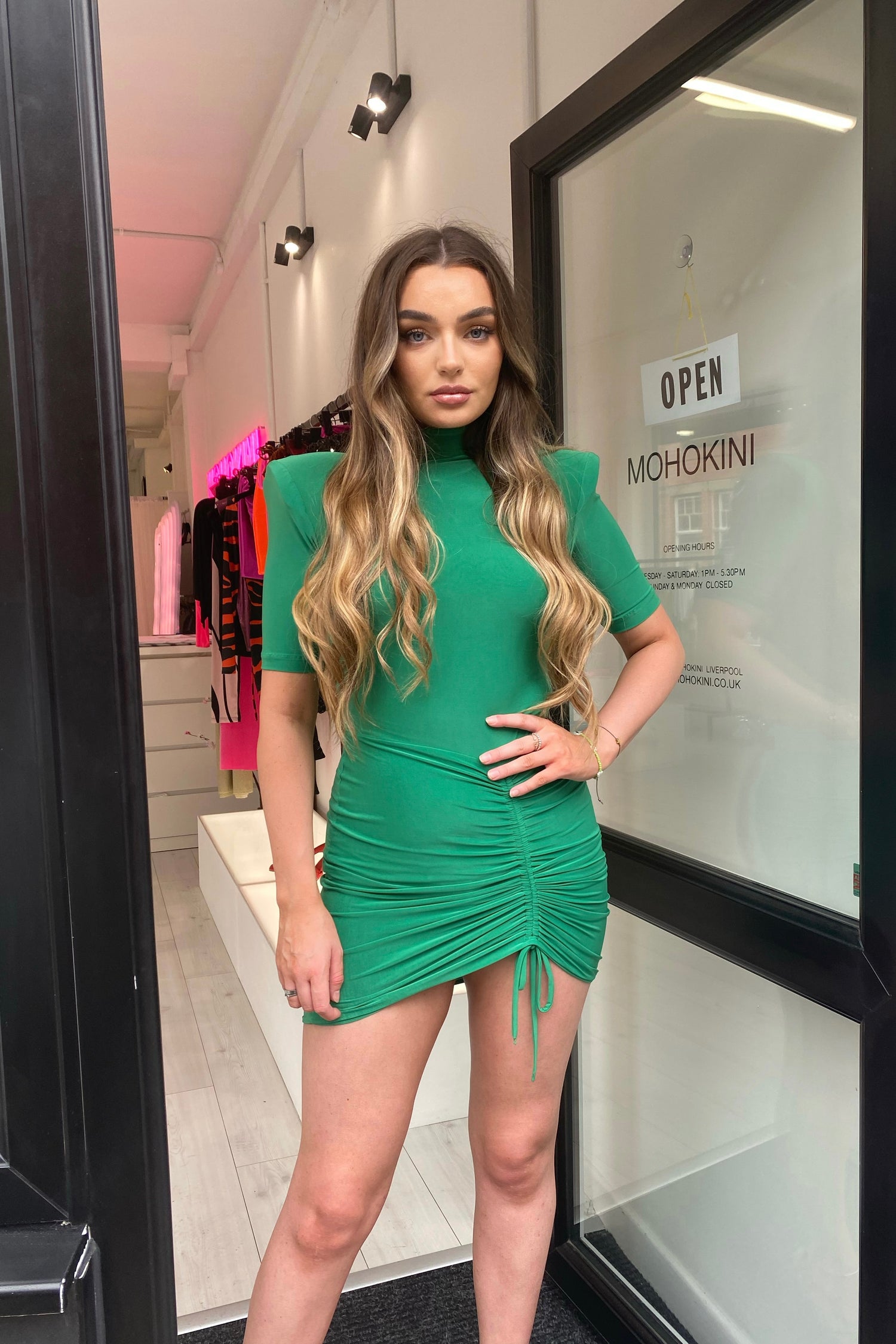 The 'REYA’ dress features a high neck and bold shoulder pads as well as ruching through the body, strategically placed to flatter.