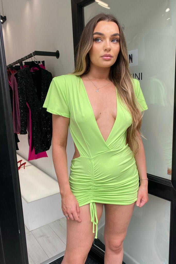 RIO BACKLESS PLUNGE DRESS FEATURING PADDED SHOULDER AND SHORT FLARED SLEEVE